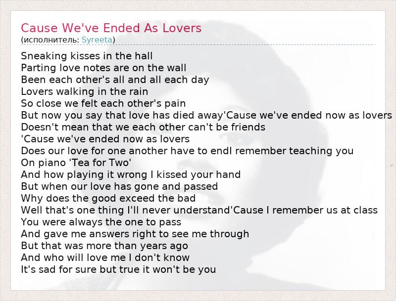 Sneaking kisses in the hall Parting love notes are on the wall Been each other's all and all each day Lovers walking in the rain So close we felt each other's pain But now you say that love has died away'Cause we've ended now as lovers Doesn't mean that we each other can't be friends 'Cause we've ended now as lovers Does our love for one another have to endI remember teaching you On piano 'Tea for Two' And how playing it wrong I kissed your hand But when our love has gone and passed Why does the good exceed the bad Well that's one thing I'll never understand'Cause I remember us at class You were always the one to pass And gave me answers right to see me through But that was more than years ago And who will love me I don't know It's sad for sure but true it won't be you