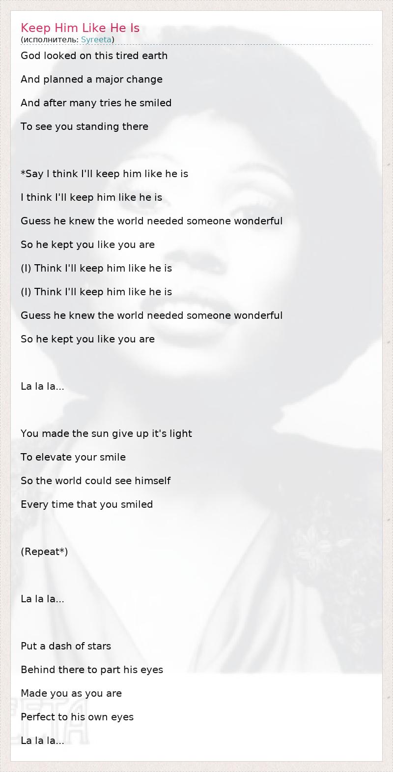 God looked on this tired earth And planned a major change And after many tries he smiled To see you standing there *Say l think I'll keep him like he is I think I'll keep him like he is Guess he knew the world needed someone wonderful So he kept you like you are (I) Think I'll keep him like he is (I) Think I'll keep him like he is Guess he knew the world needed someone wonderful So he kept you like you are La la la... You made the sun give up it's light To elevate your smile So the world could see himself Every time that you smiled (Repeat*) La la la... Put a dash of stars Behind there to part his eyes Made you as you are Perfect to his own eyes La la la...