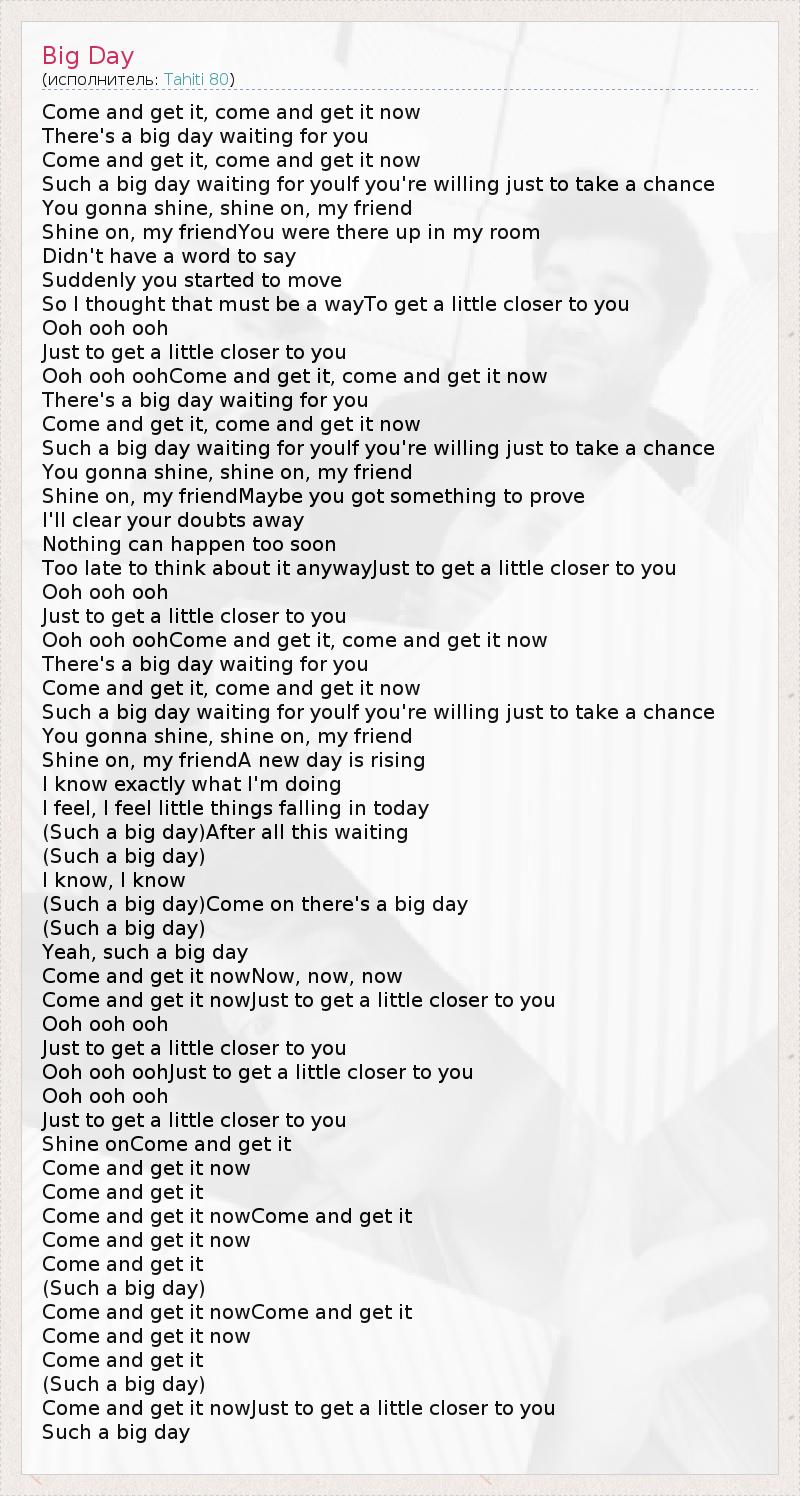 Come and get it, come and get it now There's a big day waiting for you Come and get it, come and get it now Such a big day waiting for youIf you're willing just to take a chance You gonna shine, shine on, my friend Shine on, my friendYou were there up in my room Didn't have a word to say Suddenly you started to move So I thought that must be a wayTo get a little closer to you Ooh ooh ooh Just to get a little closer to you Ooh ooh oohCome and get it, come and get it now There's a big day waiting for you Come and get it, come and get it now Such a big day waiting for youIf you're willing just to take a chance You gonna shine, shine on, my friend Shine on, my friendMaybe you got something to prove I'll clear your doubts away Nothing can happen too soon Too late to think about it anywayJust to get a little closer to you Ooh ooh ooh Just to get a little closer to you Ooh ooh oohCome and get it, come and get it now There's a big day waiting for you Come and get it, come and get it now Such a big day waiting for youIf you're willing just to take a chance You gonna shine, shine on, my friend Shine on, my friendA new day is rising I know exactly what I'm doing I feel, I feel little things falling in today (Such a big day)After all this waiting (Such a big day) I know, I know (Such a big day)Come on there's a big day (Such a big day) Yeah, such a big day Come and get it nowNow, now, now Come and get it nowJust to get a little closer to you Ooh ooh ooh Just to get a little closer to you Ooh ooh oohJust to get a little closer to you Ooh ooh ooh Just to get a little closer to you Shine onCome and get it Come and get it now Come and get it Come and get it nowCome and get it Come and get it now Come and get it (Such a big day) Come and get it nowCome and get it Come and get it now Come and get it (Such a big day) Come and get it nowJust to get a little closer to you Such a big day