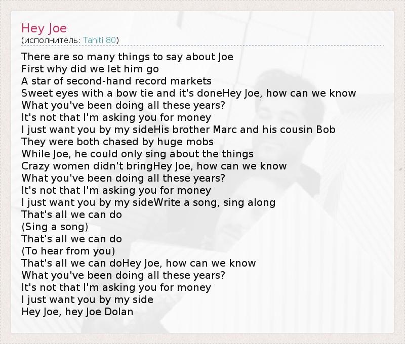 There are so many things to say about Joe First why did we let him go A star of second-hand record markets Sweet eyes with a bow tie and it's doneHey Joe, how can we know What you've been doing all these years? It's not that I'm asking you for money I just want you by my sideHis brother Marc and his cousin Bob They were both chased by huge mobs While Joe, he could only sing about the things Crazy women didn't bringHey Joe, how can we know What you've been doing all these years? It's not that I'm asking you for money I just want you by my sideWrite a song, sing along That's all we can do (Sing a song) That's all we can do (To hear from you) That's all we can doHey Joe, how can we know What you've been doing all these years? It's not that I'm asking you for money I just want you by my side Hey Joe, hey Joe Dolan
