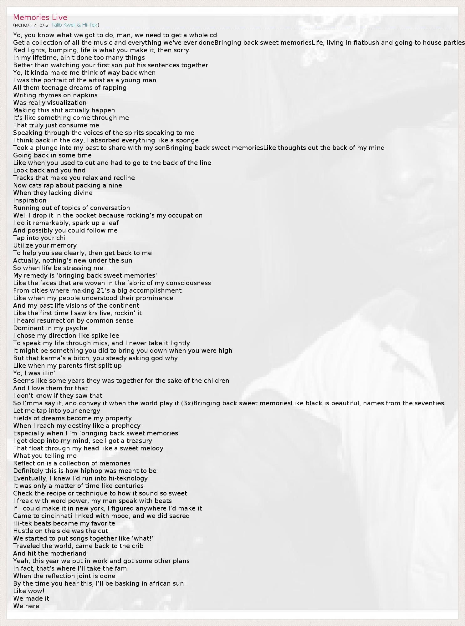 Yo, you know what we got to do, man, we need to get a whole cd Get a collection of all the music and everything we've ever doneBringing back sweet memoriesLife, living in flatbush and going to house parties Red lights, bumping, life is what you make it, then sorry In my lifetime, ain't done too many things Better than watching your first son put his sentences together Yo, it kinda make me think of way back when I was the portrait of the artist as a young man All them teenage dreams of rapping Writing rhymes on napkins Was really visualization Making this shit actually happen It's like something come through me That truly just consume me Speaking through the voices of the spirits speaking to me I think back in the day, I absorbed everything like a sponge Took a plunge into my past to share with my sonBringing back sweet memoriesLike thoughts out the back of my mind Going back in some time Like when you used to cut and had to go to the back of the line Look back and you find Tracks that make you relax and recline Now cats rap about packing a nine When they lacking divine Inspiration Running out of topics of conversation Well I drop it in the pocket because rocking's my occupation I do it remarkably, spark up a leaf And possibly you could follow me Tap into your chi Utilize your memory To help you see clearly, then get back to me Actually, nothing's new under the sun So when life be stressing me My remedy is 'bringing back sweet memories' Like the faces that are woven in the fabric of my consciousness From cities where making 21's a big accomplishment Like when my people understood their prominence And my past life visions of the continent Like the first time I saw krs live, rockin' it I heard resurrection by common sense Dominant in my psyche I chose my direction like spike lee To speak my life through mics, and I never take it lightly It might be something you did to bring you down when you were high But that karma's a bitch, you steady asking god why Like when my parents first split up Yo, I was illin' Seems like some years they was together for the sake of the children And I love them for that I don't know if they saw that So I'mma say it, and convey it when the world play it (3x)Bringing back sweet memoriesLike black is beautiful, names from the seventies Let me tap into your energy Fields of dreams become my property When I reach my destiny like a prophecy Especially when I 'm 'bringing back sweet memories' I got deep into my mind, see I got a treasury That float through my head like a sweet melody What you telling me Reflection is a collection of memories Definitely this is how hiphop was meant to be Eventually, I knew I'd run into hi-teknology It was only a matter of time like centuries Check the recipe or technique to how it sound so sweet I freak with word power, my man speak with beats If I could make it in new york, I figured anywhere I'd make it Came to cincinnati linked with mood, and we did sacred Hi-tek beats became my favorite Hustle on the side was the cut We started to put songs together like 'what!' Traveled the world, came back to the crib And hit the motherland Yeah, this year we put in work and got some other plans In fact, that's where I'll take the fam When the reflection joint is done By the time you hear this, I'll be basking in african sun Like wow! We made it We here