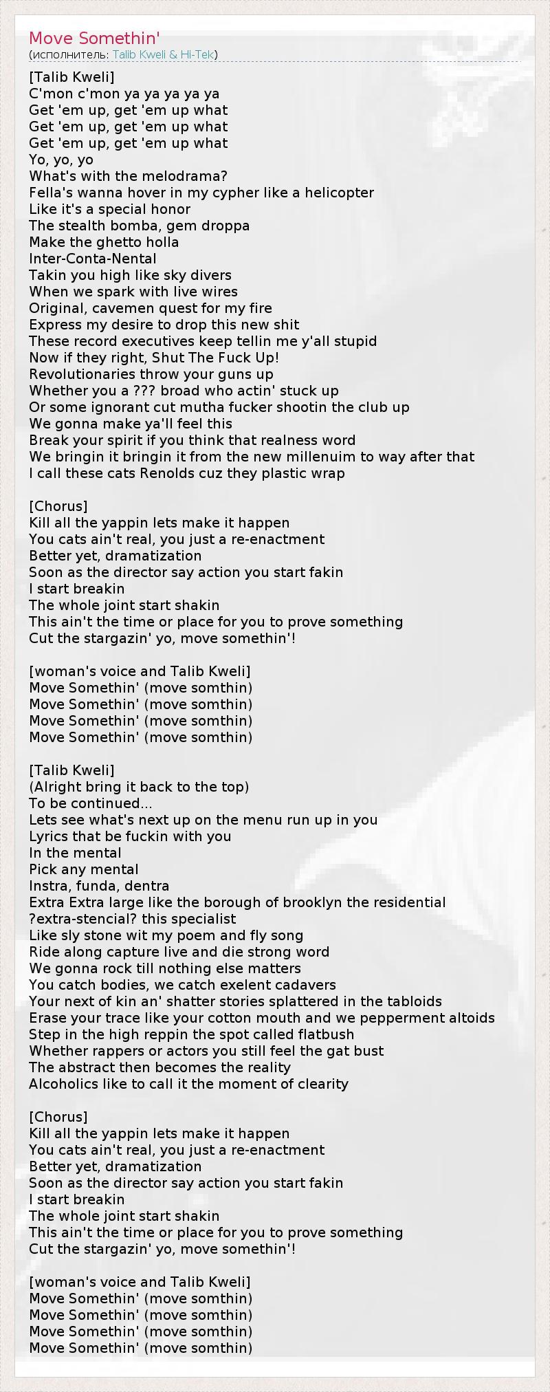 [Talib Kweli] C'mon c'mon ya ya ya ya ya Get 'em up, get 'em up what Get 'em up, get 'em up what Get 'em up, get 'em up what Yo, yo, yo What's with the melodrama? Fella's wanna hover in my cypher like a helicopter Like it's a special honor The stealth bomba, gem droppa Make the ghetto holla Inter-Conta-Nental Takin you high like sky divers When we spark with live wires Original, cavemen quest for my fire Express my desire to drop this new shit These record executives keep tellin me y'all stupid Now if they right, Shut The Fuck Up! Revolutionaries throw your guns up Whether you a ??? broad who actin' stuck up Or some ignorant cut mutha fucker shootin the club up We gonna make ya'll feel this Break your spirit if you think that realness word We bringin it bringin it from the new millenuim to way after that I call these cats Renolds cuz they plastic wrap [Chorus] Kill all the yappin lets make it happen You cats ain't real, you just a re-enactment Better yet, dramatization Soon as the director say action you start fakin I start breakin The whole joint start shakin This ain't the time or place for you to prove something Cut the stargazin' yo, move somethin'! [woman's voice and Talib Kweli] Move Somethin' (move somthin) Move Somethin' (move somthin) Move Somethin' (move somthin) Move Somethin' (move somthin) [Talib Kweli] (Alright bring it back to the top) To be continued... Lets see what's next up on the menu run up in you Lyrics that be fuckin with you In the mental Pick any mental Instra, funda, dentra Extra Extra large like the borough of brooklyn the residential ?extra-stencial? this specialist Like sly stone wit my poem and fly song Ride along capture live and die strong word We gonna rock till nothing else matters You catch bodies, we catch exelent cadavers Your next of kin an' shatter stories splattered in the tabloids Erase your trace like your cotton mouth and we pepperment altoids Step in the high reppin the spot called flatbush Whether rappers or actors you still feel the gat bust The abstract then becomes the reality Alcoholics like to call it the moment of clearity [Chorus] Kill all the yappin lets make it happen You cats ain't real, you just a re-enactment Better yet, dramatization Soon as the director say action you start fakin I start breakin The whole joint start shakin This ain't the time or place for you to prove something Cut the stargazin' yo, move somethin'! [woman's voice and Talib Kweli] Move Somethin' (move somthin) Move Somethin' (move somthin) Move Somethin' (move somthin) Move Somethin' (move somthin)