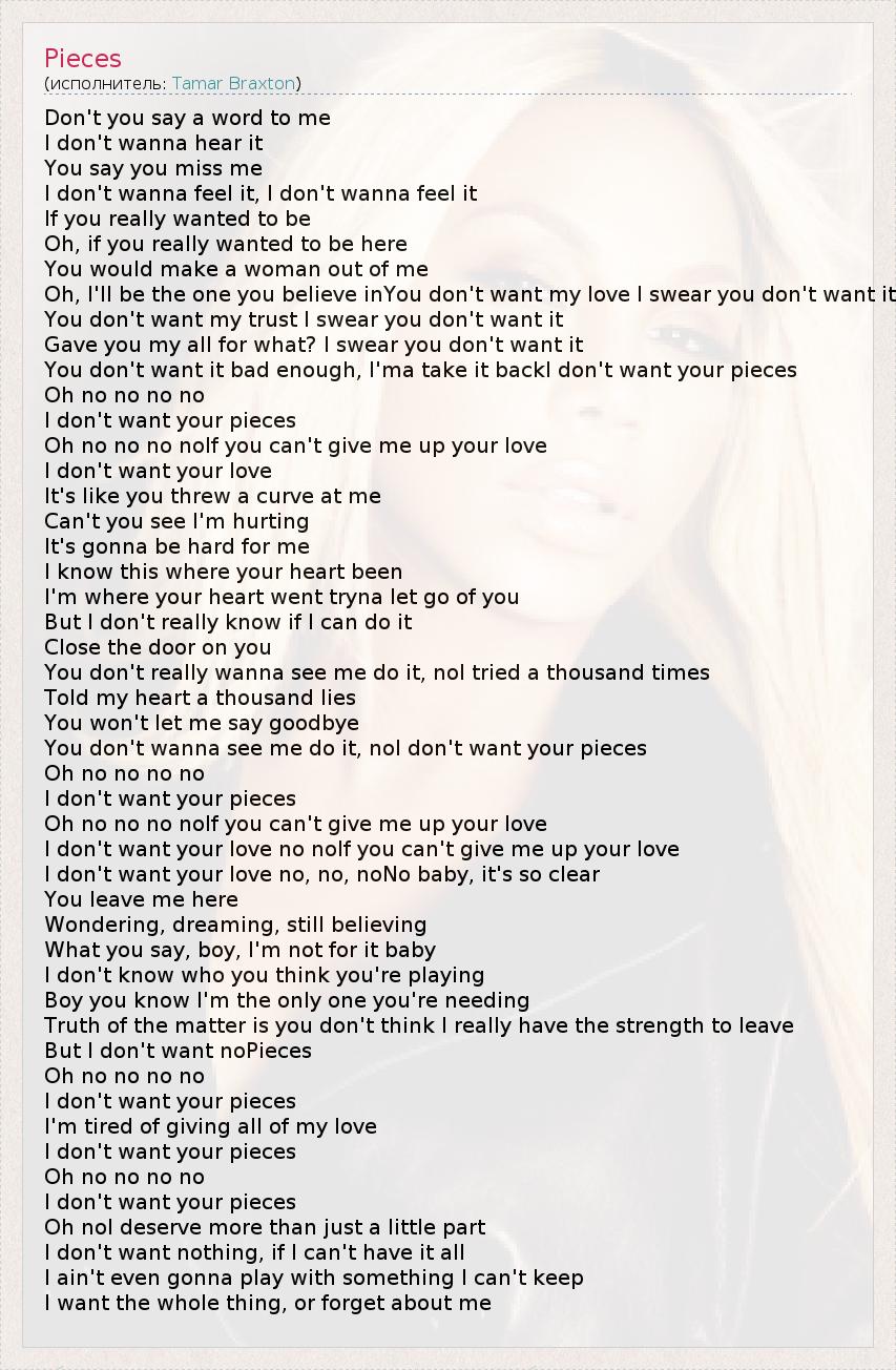Don't you say a word to me I don't wanna hear it You say you miss me I don't wanna feel it, I don't wanna feel it If you really wanted to be Oh, if you really wanted to be here You would make a woman out of me Oh, I'll be the one you believe inYou don't want my love I swear you don't want it You don't want my trust I swear you don't want it Gave you my all for what? I swear you don't want it You don't want it bad enough, I'ma take it backI don't want your pieces Oh no no no no I don't want your pieces Oh no no no noIf you can't give me up your love I don't want your love It's like you threw a curve at me Can't you see I'm hurting It's gonna be hard for me I know this where your heart been I'm where your heart went tryna let go of you But I don't really know if I can do it Close the door on you You don't really wanna see me do it, noI tried a thousand times Told my heart a thousand lies You won't let me say goodbye You don't wanna see me do it, noI don't want your pieces Oh no no no no I don't want your pieces Oh no no no noIf you can't give me up your love I don't want your love no noIf you can't give me up your love I don't want your love no, no, noNo baby, it's so clear You leave me here Wondering, dreaming, still believing What you say, boy, I'm not for it baby I don't know who you think you're playing Boy you know I'm the only one you're needing Truth of the matter is you don't think I really have the strength to leave But I don't want noPieces Oh no no no no I don't want your pieces I'm tired of giving all of my love I don't want your pieces Oh no no no no I don't want your pieces Oh noI deserve more than just a little part I don't want nothing, if I can't have it all I ain't even gonna play with something I can't keep I want the whole thing, or forget about me