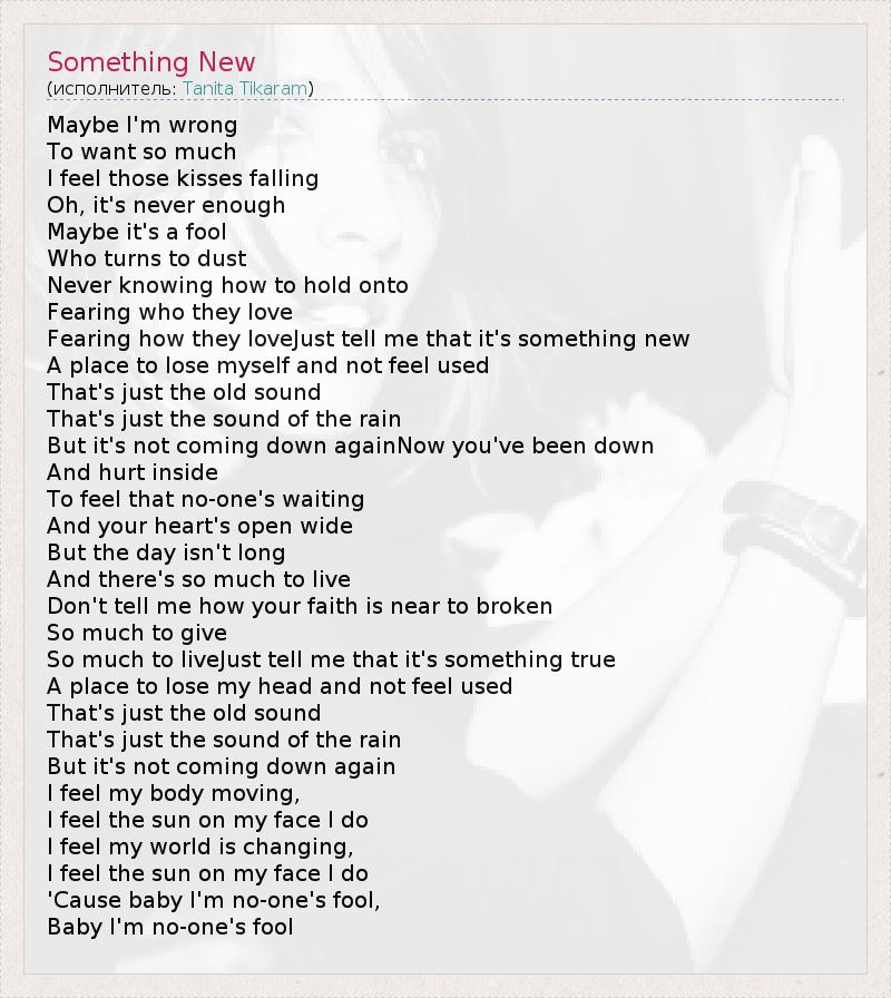 Maybe I'm wrong To want so much I feel those kisses falling Oh, it's never enough Maybe it's a fool Who turns to dust Never knowing how to hold onto Fearing who they love Fearing how they loveJust tell me that it's something new A place to lose myself and not feel used That's just the old sound That's just the sound of the rain But it's not coming down againNow you've been down And hurt inside To feel that no-one's waiting And your heart's open wide But the day isn't long And there's so much to live Don't tell me how your faith is near to broken So much to give So much to liveJust tell me that it's something true A place to lose my head and not feel used That's just the old sound That's just the sound of the rain But it's not coming down again I feel my body moving, I feel the sun on my face I do I feel my world is changing, I feel the sun on my face I do 'Cause baby I'm no-one's fool, Baby I'm no-one's fool