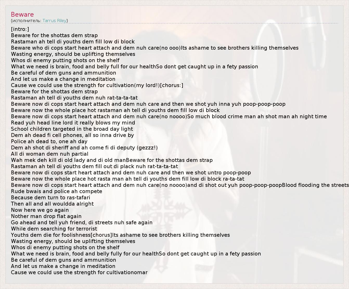 [intro:] Beware for the shottas dem strap Rastaman ah tell di youths dem fill low di block Beware who di cops start heart attach and dem nuh care(no ooo)Its ashame to see brothers killing themselves Wasting energy, should be uplifting themselves Whos di enemy putting shots on the shelf What we need is brain, food and belly full for our healthSo dont get caught up in a fety passion Be careful of dem guns and ammunition And let us make a change in meditation Cause we could use the strength for cultivation(my lord!)[chorus:] Beware for the shottas dem strap Rastaman ah tell di youths dem nuh rat-ta-ta-tat Beware now di cops start heart attach and dem nuh care and then we shot yuh inna yuh poop-poop-poop Beware now the whole place hot rastaman ah tell di youths dem fill low di block Beware now di cops start heart attach and dem nuh care(no noooo)So much blood crime man ah shot man ah night time Read yuh head line lord it really blows my mind School children targeted in the broad day light Dem ah dead fi cell phones, all so inna drive by Police ah dead to, one ah day Dem ah shot di sheriff and ah come fi di deputy (gezzz!) All di woman dem nuh partial Wah mek deh kill di old lady and di old manBeware for the shottas dem strap Rastaman ah tell di youths dem fill out di plack nuh rat-ta-ta-tat Beware now di cops start heart attach and dem nuh care and then we shot untro poop-poop Beware now the whole place hot rasta man ah tell di youths dem fill low di block ra-ta-tat Beware now di cops start heart attach and dem nuh care(no noooo)and di shot out yuh poop-poop-poopBlood flooding the streets Rude bwais and police ah compete Because dem turn to ras-tafari Then all and all wouldda alright Now here we go again Nother man drop flat again Go ahead and tell yuh friend, di streets nuh safe again While dem searching for terrorist Youths dem die for foolishness[chorus]Its ashame to see brothers killing themselves Wasting energy, should be uplifting themselves Whos di enemy putting shots on the shelf What we need is brain, food and belly fully for our healthSo dont get caught up in a fety passion Be careful of dem guns and ammunition And let us make a change in meditation Cause we could use the strength for cultivationomar