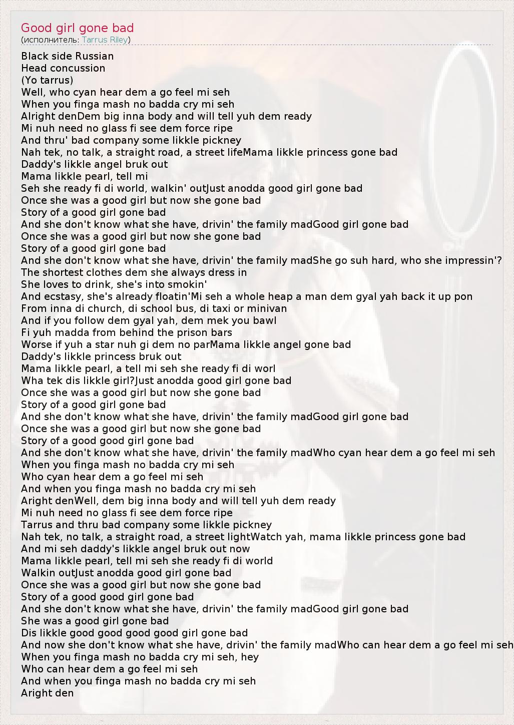 Black side Russian Head concussion (Yo tarrus) Well, who cyan hear dem a go feel mi seh When you finga mash no badda cry mi seh Alright denDem big inna body and will tell yuh dem ready Mi nuh need no glass fi see dem force ripe And thru' bad company some likkle pickney Nah tek, no talk, a straight road, a street lifeMama likkle princess gone bad Daddy's likkle angel bruk out Mama likkle pearl, tell mi Seh she ready fi di world, walkin' outJust anodda good girl gone bad Once she was a good girl but now she gone bad Story of a good girl gone bad And she don't know what she have, drivin' the family madGood girl gone bad Once she was a good girl but now she gone bad Story of a good girl gone bad And she don't know what she have, drivin' the family madShe go suh hard, who she impressin'? The shortest clothes dem she always dress in She loves to drink, she's into smokin' And ecstasy, she's already floatin'Mi seh a whole heap a man dem gyal yah back it up pon From inna di church, di school bus, di taxi or minivan And if you follow dem gyal yah, dem mek you bawl Fi yuh madda from behind the prison bars Worse if yuh a star nuh gi dem no parMama likkle angel gone bad Daddy's likkle princess bruk out Mama likkle pearl, a tell mi seh she ready fi di worl Wha tek dis likkle girl?Just anodda good girl gone bad Once she was a good girl but now she gone bad Story of a good girl gone bad And she don't know what she have, drivin' the family madGood girl gone bad Once she was a good girl but now she gone bad Story of a good good girl gone bad And she don't know what she have, drivin' the family madWho cyan hear dem a go feel mi seh When you finga mash no badda cry mi seh Who cyan hear dem a go feel mi seh And when you finga mash no badda cry mi seh Aright denWell, dem big inna body and will tell yuh dem ready Mi nuh need no glass fi see dem force ripe Tarrus and thru bad company some likkle pickney Nah tek, no talk, a straight road, a street lightWatch yah, mama likkle princess gone bad And mi seh daddy's likkle angel bruk out now Mama likkle pearl, tell mi seh she ready fi di world Walkin outJust anodda good girl gone bad Once she was a good girl but now she gone bad Story of a good good girl gone bad And she don't know what she have, drivin' the family madGood girl gone bad She was a good girl gone bad Dis likkle good good good good girl gone bad And now she don't know what she have, drivin' the family madWho can hear dem a go feel mi seh When you finga mash no badda cry mi seh, hey Who can hear dem a go feel mi seh And when you finga mash no badda cry mi seh Aright den