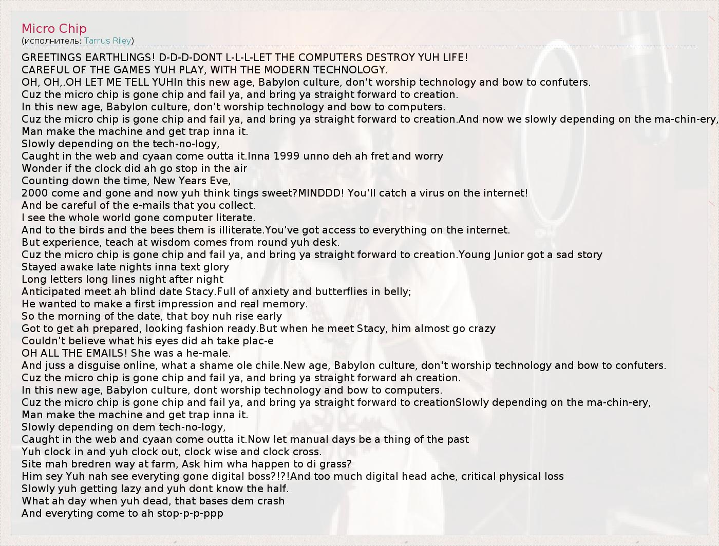 GREETINGS EARTHLINGS! D-D-D-DONT L-L-L-LET THE COMPUTERS DESTROY YUH LIFE! CAREFUL OF THE GAMES YUH PLAY, WITH THE MODERN TECHNOLOGY. OH, OH,.OH LET ME TELL YUHIn this new age, Babylon culture, don't worship technology and bow to confuters. Cuz the micro chip is gone chip and fail ya, and bring ya straight forward to creation. In this new age, Babylon culture, don't worship technology and bow to computers. Cuz the micro chip is gone chip and fail ya, and bring ya straight forward to creation.And now we slowly depending on the ma-chin-ery, Man make the machine and get trap inna it. Slowly depending on the tech-no-logy, Caught in the web and cyaan come outta it.Inna 1999 unno deh ah fret and worry Wonder if the clock did ah go stop in the air Counting down the time, New Years Eve, 2000 come and gone and now yuh think tings sweet?MINDDD! You'll catch a virus on the internet! And be careful of the e-mails that you collect. I see the whole world gone computer literate. And to the birds and the bees them is illiterate.You've got access to everything on the internet. But experience, teach at wisdom comes from round yuh desk. Cuz the micro chip is gone chip and fail ya, and bring ya straight forward to creation.Young Junior got a sad story Stayed awake late nights inna text glory Long letters long lines night after night Anticipated meet ah blind date Stacy.Full of anxiety and butterflies in belly; He wanted to make a first impression and real memory. So the morning of the date, that boy nuh rise early Got to get ah prepared, looking fashion ready.But when he meet Stacy, him almost go crazy Couldn't believe what his eyes did ah take plac-e OH ALL THE EMAILS! She was a he-male. And juss a disguise online, what a shame ole chile.New age, Babylon culture, don't worship technology and bow to confuters. Cuz the micro chip is gone chip and fail ya, and bring ya straight forward ah creation. In this new age, Babylon culture, dont worship technology and bow to computers. Cuz the micro chip is gone chip and fail ya, and bring ya straight forward to creationSlowly depending on the ma-chin-ery, Man make the machine and get trap inna it. Slowly depending on dem tech-no-logy, Caught in the web and cyaan come outta it.Now let manual days be a thing of the past Yuh clock in and yuh clock out, clock wise and clock cross. Site mah bredren way at farm, Ask him wha happen to di grass? Him sey Yuh nah see everyting gone digital boss?!?!And too much digital head ache, critical physical loss Slowly yuh getting lazy and yuh dont know the half. What ah day when yuh dead, that bases dem crash And everyting come to ah stop-p-p-ppp