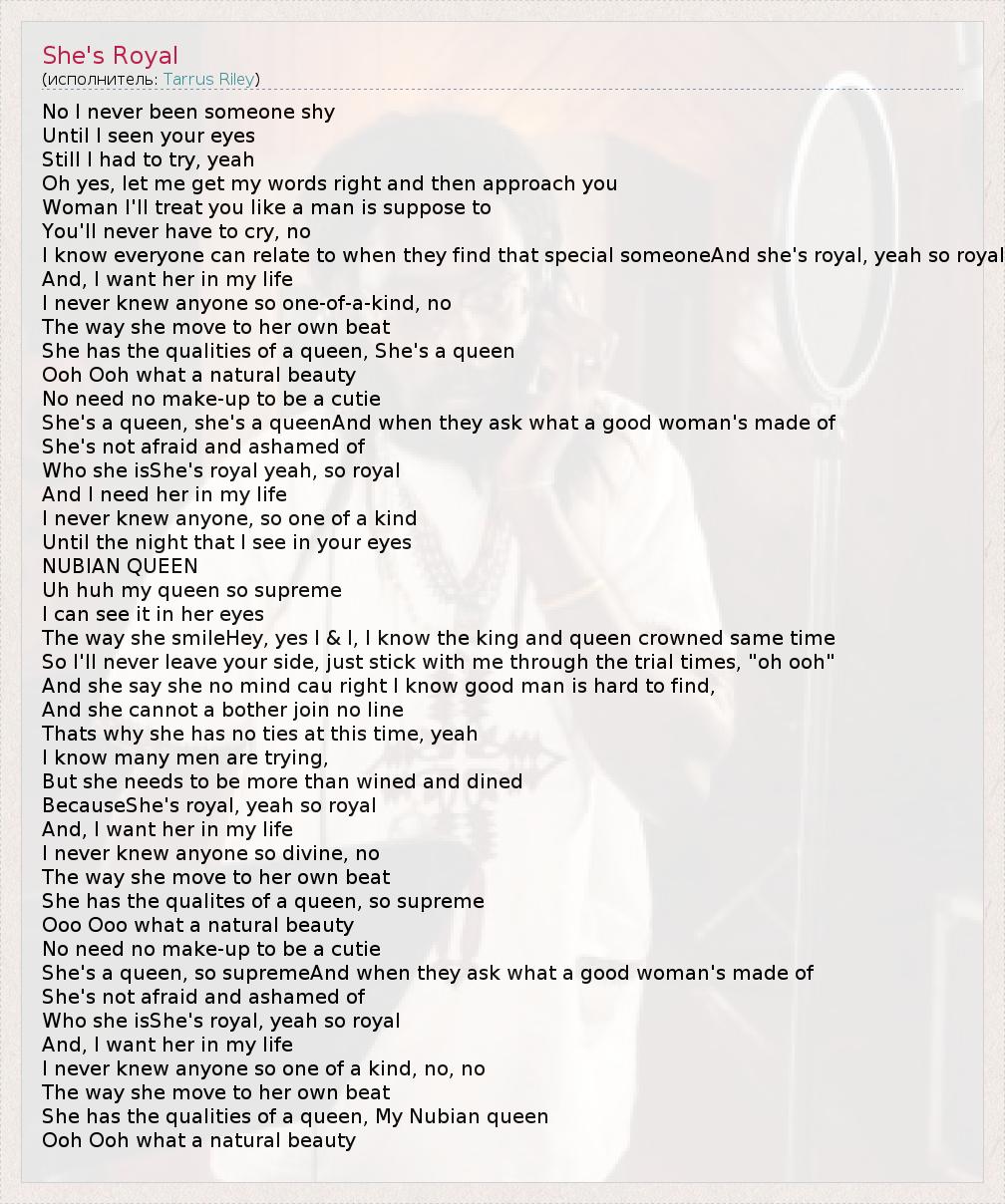 No I never been someone shy Until I seen your eyes Still I had to try, yeah Oh yes, let me get my words right and then approach you Woman I'll treat you like a man is suppose to You'll never have to cry, no I know everyone can relate to when they find that special someoneAnd she's royal, yeah so royal And, I want her in my life I never knew anyone so one-of-a-kind, no The way she move to her own beat She has the qualities of a queen, She's a queen Ooh Ooh what a natural beauty No need no make-up to be a cutie She's a queen, she's a queenAnd when they ask what a good woman's made of She's not afraid and ashamed of Who she isShe's royal yeah, so royal And I need her in my life I never knew anyone, so one of a kind Until the night that I see in your eyes NUBIAN QUEEN Uh huh my queen so supreme I can see it in her eyes The way she smileHey, yes I & I, I know the king and queen crowned same time So I'll never leave your side, just stick with me through the trial times, "oh ooh" And she say she no mind cau right I know good man is hard to find, And she cannot a bother join no line Thats why she has no ties at this time, yeah I know many men are trying, But she needs to be more than wined and dined BecauseShe's royal, yeah so royal And, I want her in my life I never knew anyone so divine, no The way she move to her own beat She has the qualites of a queen, so supreme Ooo Ooo what a natural beauty No need no make-up to be a cutie She's a queen, so supremeAnd when they ask what a good woman's made of She's not afraid and ashamed of Who she isShe's royal, yeah so royal And, I want her in my life I never knew anyone so one of a kind, no, no The way she move to her own beat She has the qualities of a queen, My Nubian queen Ooh Ooh what a natural beauty