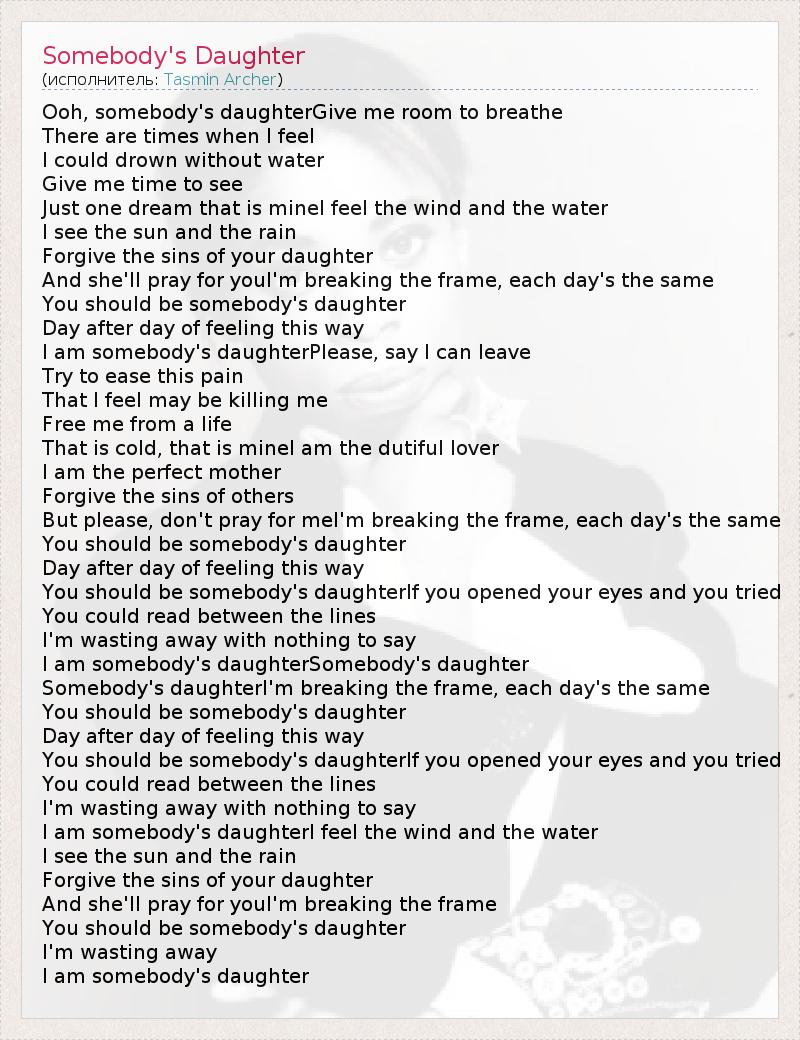 Ooh, somebody's daughterGive me room to breathe There are times when I feel I could drown without water Give me time to see Just one dream that is mineI feel the wind and the water I see the sun and the rain Forgive the sins of your daughter And she'll pray for youI'm breaking the frame, each day's the same You should be somebody's daughter Day after day of feeling this way I am somebody's daughterPlease, say I can leave Try to ease this pain That I feel may be killing me Free me from a life That is cold, that is mineI am the dutiful lover I am the perfect mother Forgive the sins of others But please, don't pray for meI'm breaking the frame, each day's the same You should be somebody's daughter Day after day of feeling this way You should be somebody's daughterIf you opened your eyes and you tried You could read between the lines I'm wasting away with nothing to say I am somebody's daughterSomebody's daughter Somebody's daughterI'm breaking the frame, each day's the same You should be somebody's daughter Day after day of feeling this way You should be somebody's daughterIf you opened your eyes and you tried You could read between the lines I'm wasting away with nothing to say I am somebody's daughterI feel the wind and the water I see the sun and the rain Forgive the sins of your daughter And she'll pray for youI'm breaking the frame You should be somebody's daughter I'm wasting away I am somebody's daughter