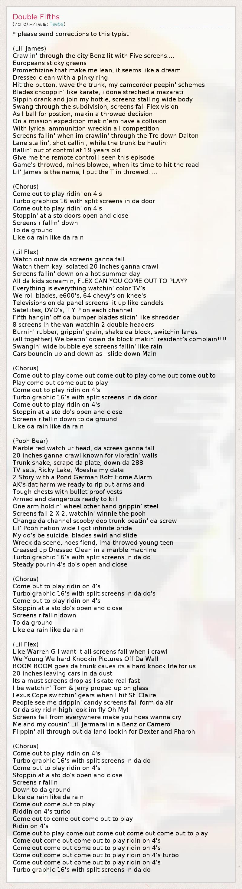 * please send corrections to this typist (Lil' James) Crawlin' through the city Benz lit with Five screens.... Europeans sticky greens Promethizine that make me lean, it seems like a dream Dressed clean with a pinky ring Hit the button, wave the trunk, my camcorder peepin' schemes Blades chooppin' like karate, i done streched a mazarati Sippin drank and join my hottie, screenz stalling wide body Swang through the subdivision, screens fall Flex vision As I ball for postion, makin a throwed decision On a mission expedition makin'em have a collision With lyrical ammunition wreckin all competition Screens fallin' when im crawlin' through the Tre down Dalton Lane stallin', shot callin', while the trunk be haulin' Ballin' out of control at 19 years old Give me the remote control i seen this episode Game's throwed, minds blowed, when its time to hit the road Lil' James is the name, I put the T in throwed..... (Chorus) Come out to play ridin' on 4's Turbo graphics 16 with split screens in da door Come out to play ridin' on 4's Stoppin' at a sto doors open and close Screens r fallin' down To da ground Like da rain like da rain (Lil Flex) Watch out now da screens ganna fall Watch them kay isolated 20 inches ganna crawl Screens fallin' down on a hot summer day All da kids screamin, FLEX CAN YOU COME OUT TO PLAY? Everything is everything watchin' color TV's We roll blades, e600's, 64 chevy's on knee's Televisions on da panel screens lit up like candels Satellites, DVD's, T Y P on each channel Fifth hangin' off da bumper blades slicin' like shredder 8 screens in the van watchin 2 double headers Burnin' rubber, grippin' grain, shake da block, switchin lanes (all together) We beatin' down da block makin' resident's complain!!!! Swangin' wide bubble eye screens fallin' like rain Cars bouncin up and down as I slide down Main (Chorus) Come out to play come out come out to play come out come out to Play come out come out to play Come out to play ridin on 4's Turbo graphic 16's with split screens in da door Come out to play ridin on 4's Stoppin at a sto do's open and close Screens r fallin down to da ground Like da rain like da rain (Pooh Bear) Marble red watch ur head, da screes ganna fall 20 inches ganna crawl known for vibratin' walls Trunk shake, scrape da plate, down da 288 TV sets, Ricky Lake, Moesha my date 2 Story with a Pond German Rott Home Alarm AK's dat harm we ready to rip out arms and Tough chests with bullet proof vests Armed and dangerous ready to kill One arm holdin' wheel other hand grippin' steel Screens fall 2 X 2, watchin' winnie the pooh Change da channel scooby doo trunk beatin' da screw Lil' Pooh nation wide I got infinite pride My do's be suicide, blades swirl and slide Wreck da scene, hoes fiend, ima throwed young teen Creased up Dressed Clean in a marble machine Turbo graphic 16's with split screens in da do Steady pourin 4's do's open and close (Chorus) Come put to play ridin on 4's Turbo graphic 16's with split screens in da do's Come put to play ridin on 4's Stoppin at a sto do's open and close Screens r fallin down To da ground Like da rain like da rain (Lil Flex) Like Warren G I want it all screens fall when i crawl We Young We hard Knockin Pictures Off Da Wall BOOM BOOM goes da trunk caues its a hard knock life for us 20 inches leaving cars in da dust Its a must screens drop as I skate real fast I be watchin' Tom & Jerry proped up on glass Lexus Cope switchin' gears when I hit St. Claire People see me drippin' candy screens fall form da air Or da sky ridin high look im fly Oh My! Screens fall from everywhere make you hoes wanna cry Me and my cousin' Lil' Jermaral in a Benz or Camero Flippin' all through out da land lookin for Dexter and Pharoh (Chorus) Come out to play ridin on 4's Turbo graphic 16's with split screens in da do Come put to play ridin on 4's Stoppin at a sto do's open and close Screens r fallin Down to da ground Like da rain like da rain Come out come out to play Riddin on 4's turbo Come out to come out come out to play Ridin on 4's Come out to play come out come out come out come out to play Come out come out come out to play ridin on 4's Come out come out come out to play ridin on 4's Come out come out come out to play ridin on 4's turbo Come out come out come out to play ridin on 4's Turbo graphic 16's with split screens in da do