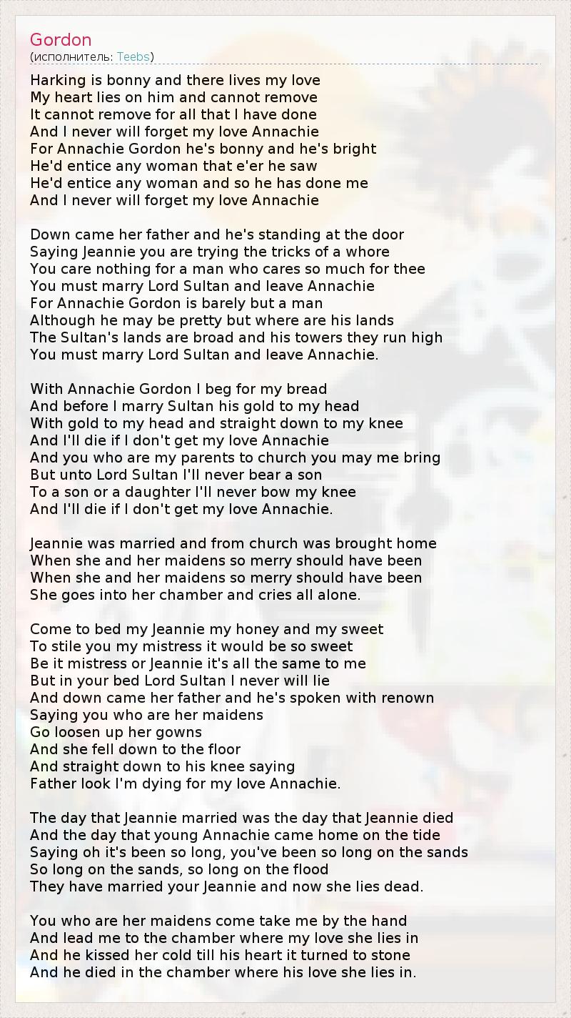 Harking is bonny and there lives my love My heart lies on him and cannot remove It cannot remove for all that I have done And I never will forget my love Annachie For Annachie Gordon he's bonny and he's bright He'd entice any woman that e'er he saw He'd entice any woman and so he has done me And I never will forget my love Annachie Down came her father and he's standing at the door Saying Jeannie you are trying the tricks of a whore You care nothing for a man who cares so much for thee You must marry Lord Sultan and leave Annachie For Annachie Gordon is barely but a man Although he may be pretty but where are his lands The Sultan's lands are broad and his towers they run high You must marry Lord Sultan and leave Annachie. With Annachie Gordon I beg for my bread And before I marry Sultan his gold to my head With gold to my head and straight down to my knee And I'll die if I don't get my love Annachie And you who are my parents to church you may me bring But unto Lord Sultan I'll never bear a son To a son or a daughter I'll never bow my knee And I'll die if I don't get my love Annachie. Jeannie was married and from church was brought home When she and her maidens so merry should have been When she and her maidens so merry should have been She goes into her chamber and cries all alone. Come to bed my Jeannie my honey and my sweet To stile you my mistress it would be so sweet Be it mistress or Jeannie it's all the same to me But in your bed Lord Sultan I never will lie And down came her father and he's spoken with renown Saying you who are her maidens Go loosen up her gowns And she fell down to the floor And straight down to his knee saying Father look I'm dying for my love Annachie. The day that Jeannie married was the day that Jeannie died And the day that young Annachie came home on the tide Saying oh it's been so long, you've been so long on the sands So long on the sands, so long on the flood They have married your Jeannie and now she lies dead. You who are her maidens come take me by the hand And lead me to the chamber where my love she lies in And he kissed her cold till his heart it turned to stone And he died in the chamber where his love she lies in.