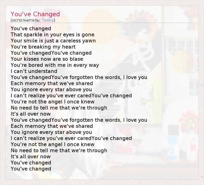 You've changed That sparkle in your eyes is gone Your smile is just a careless yawn You're breaking my heart You've changedYou've changed Your kisses now are so blase You're bored with me in every way I can't understand You've changedYou've forgotten the words, I love you Each memory that we've shared You ignore every star above you I can't realize you've ever caredYou've changed You're not the angel I once knew No need to tell me that we're through It's all over now You've changedYou've forgotten the words, I love you Each memory that we've shared You ignore every star above you I can't realize you've ever caredYou've changed You're not the angel I once knew No need to tell me that we're through It's all over now You've changed You've changed