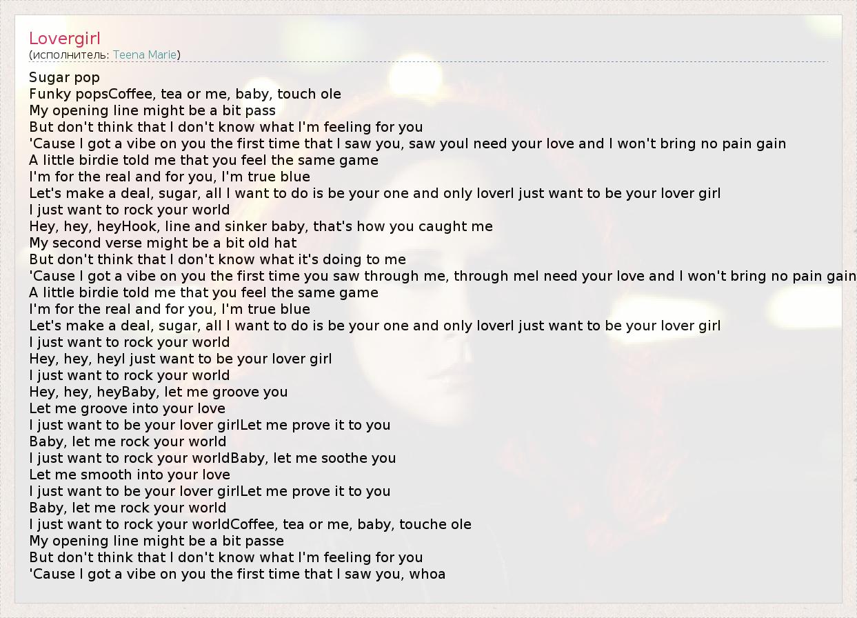 Sugar pop Funky popsCoffee, tea or me, baby, touch ole My opening line might be a bit pass But don't think that I don't know what I'm feeling for you 'Cause I got a vibe on you the first time that I saw you, saw youI need your love and I won't bring no pain gain A little birdie told me that you feel the same game I'm for the real and for you, I'm true blue Let's make a deal, sugar, all I want to do is be your one and only loverI just want to be your lover girl I just want to rock your world Hey, hey, heyHook, line and sinker baby, that's how you caught me My second verse might be a bit old hat But don't think that I don't know what it's doing to me 'Cause I got a vibe on you the first time you saw through me, through meI need your love and I won't bring no pain gain A little birdie told me that you feel the same game I'm for the real and for you, I'm true blue Let's make a deal, sugar, all I want to do is be your one and only loverI just want to be your lover girl I just want to rock your world Hey, hey, heyI just want to be your lover girl I just want to rock your world Hey, hey, heyBaby, let me groove you Let me groove into your love I just want to be your lover girlLet me prove it to you Baby, let me rock your world I just want to rock your worldBaby, let me soothe you Let me smooth into your love I just want to be your lover girlLet me prove it to you Baby, let me rock your world I just want to rock your worldCoffee, tea or me, baby, touche ole My opening line might be a bit passe But don't think that I don't know what I'm feeling for you 'Cause I got a vibe on you the first time that I saw you, whoa