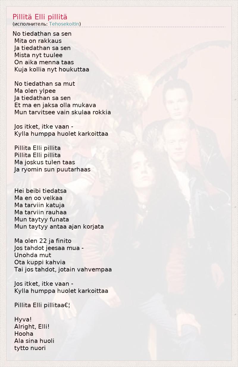 No tiedathan sa sen Mita on rakkaus Ja tiedathan sa sen Mista nyt tuulee On aika menna taas Kuja kollia nyt houkuttaa No tiedathan sa mut Ma olen ylpee Ja tiedathan sa sen Et ma en jaksa olla mukava Mun tarvitsee vain skulaa rokkia Jos itket, itke vaan - Kylla humppa huolet karkoittaa Pillita Elli pillita Pillita Elli pillita Ma joskus tulen taas Ja ryomin sun puutarhaas Hei beibi tiedatsa Ma en oo velkaa Ma tarviin katuja Ma tarviin rauhaa Mun taytyy funata Mun taytyy antaa ajan korjata Ma olen 22 ja finito Jos tahdot jeesaa mua - Unohda mut Ota kuppi kahvia Tai jos tahdot, jotain vahvempaa Jos itket, itke vaan - Kylla humppa huolet karkoittaa Pillita Elli pillitaa€¦ Hyva! Alright, Elli! Hooha Ala sina huoli tytto nuori