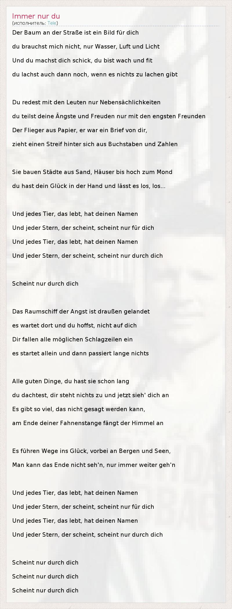 Der Baum an der Straße ist ein Bild für dich du brauchst mich nicht, nur Wasser, Luft und Licht Und du machst dich schick, du bist wach und fit du lachst auch dann noch, wenn es nichts zu lachen gibt Du redest mit den Leuten nur Nebensächlichkeiten du teilst deine Ängste und Freuden nur mit den engsten Freunden Der Flieger aus Papier, er war ein Brief von dir, zieht einen Streif hinter sich aus Buchstaben und Zahlen Sie bauen Städte aus Sand, Häuser bis hoch zum Mond du hast dein Glück in der Hand und lässt es los, los... Und jedes Tier, das lebt, hat deinen Namen Und jeder Stern, der scheint, scheint nur für dich Und jedes Tier, das lebt, hat deinen Namen Und jeder Stern, der scheint, scheint nur durch dich Scheint nur durch dich Das Raumschiff der Angst ist draußen gelandet es wartet dort und du hoffst, nicht auf dich Dir fallen alle möglichen Schlagzeilen ein es startet allein und dann passiert lange nichts Alle guten Dinge, du hast sie schon lang du dachtest, dir steht nichts zu und jetzt sieh' dich an Es gibt so viel, das nicht gesagt werden kann, am Ende deiner Fahnenstange fängt der Himmel an Es führen Wege ins Glück, vorbei an Bergen und Seen, Man kann das Ende nicht seh'n, nur immer weiter geh'n Und jedes Tier, das lebt, hat deinen Namen Und jeder Stern, der scheint, scheint nur für dich Und jedes Tier, das lebt, hat deinen Namen Und jeder Stern, der scheint, scheint nur durch dich Scheint nur durch dich Scheint nur durch dich Scheint nur durch dich