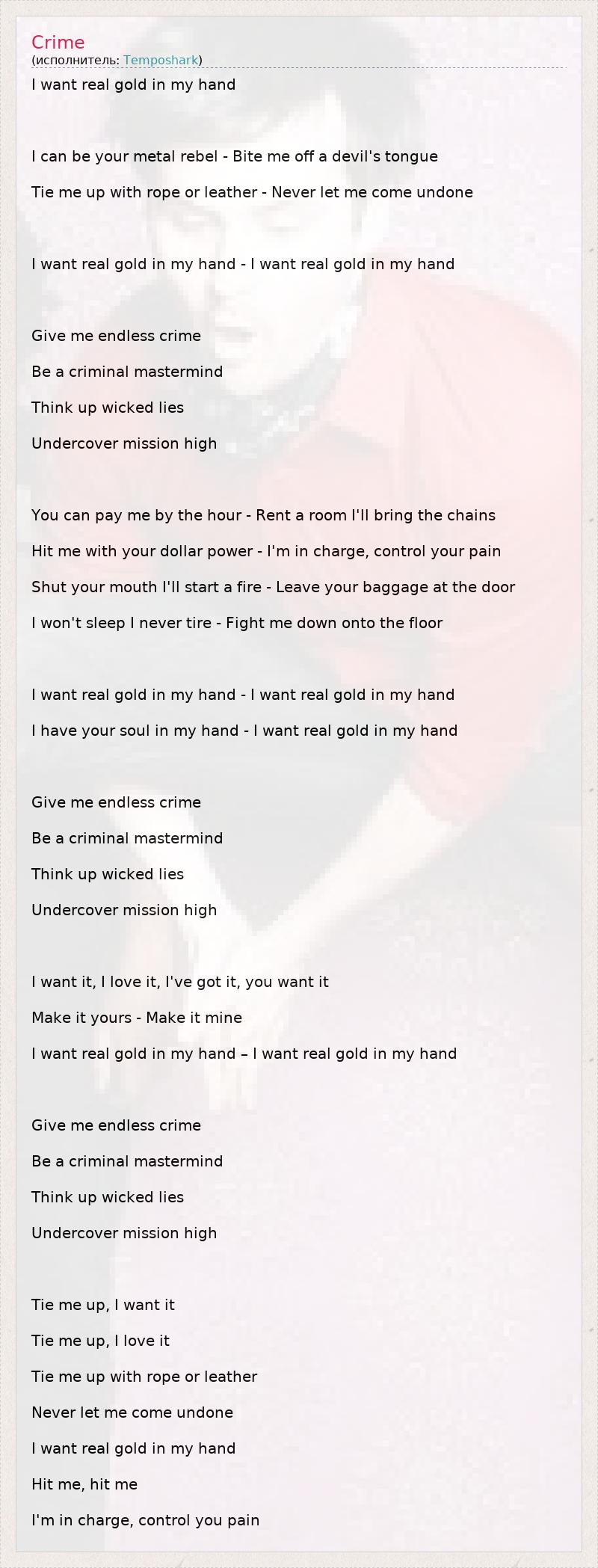 I want real gold in my hand I can be your metal rebel - Bite me off a devil's tongue Tie me up with rope or leather - Never let me come undone I want real gold in my hand - I want real gold in my hand Give me endless crime Be a criminal mastermind Think up wicked lies Undercover mission high You can pay me by the hour - Rent a room I'll bring the chains Hit me with your dollar power - I'm in charge, control your pain Shut your mouth I'll start a fire - Leave your baggage at the door I won't sleep I never tire - Fight me down onto the floor I want real gold in my hand - I want real gold in my hand I have your soul in my hand - I want real gold in my hand Give me endless crime Be a criminal mastermind Think up wicked lies Undercover mission high I want it, I love it, I've got it, you want it Make it yours - Make it mine I want real gold in my hand – I want real gold in my hand Give me endless crime Be a criminal mastermind Think up wicked lies Undercover mission high Tie me up, I want it Tie me up, I love it Tie me up with rope or leather Never let me come undone I want real gold in my hand Hit me, hit me I'm in charge, control you pain