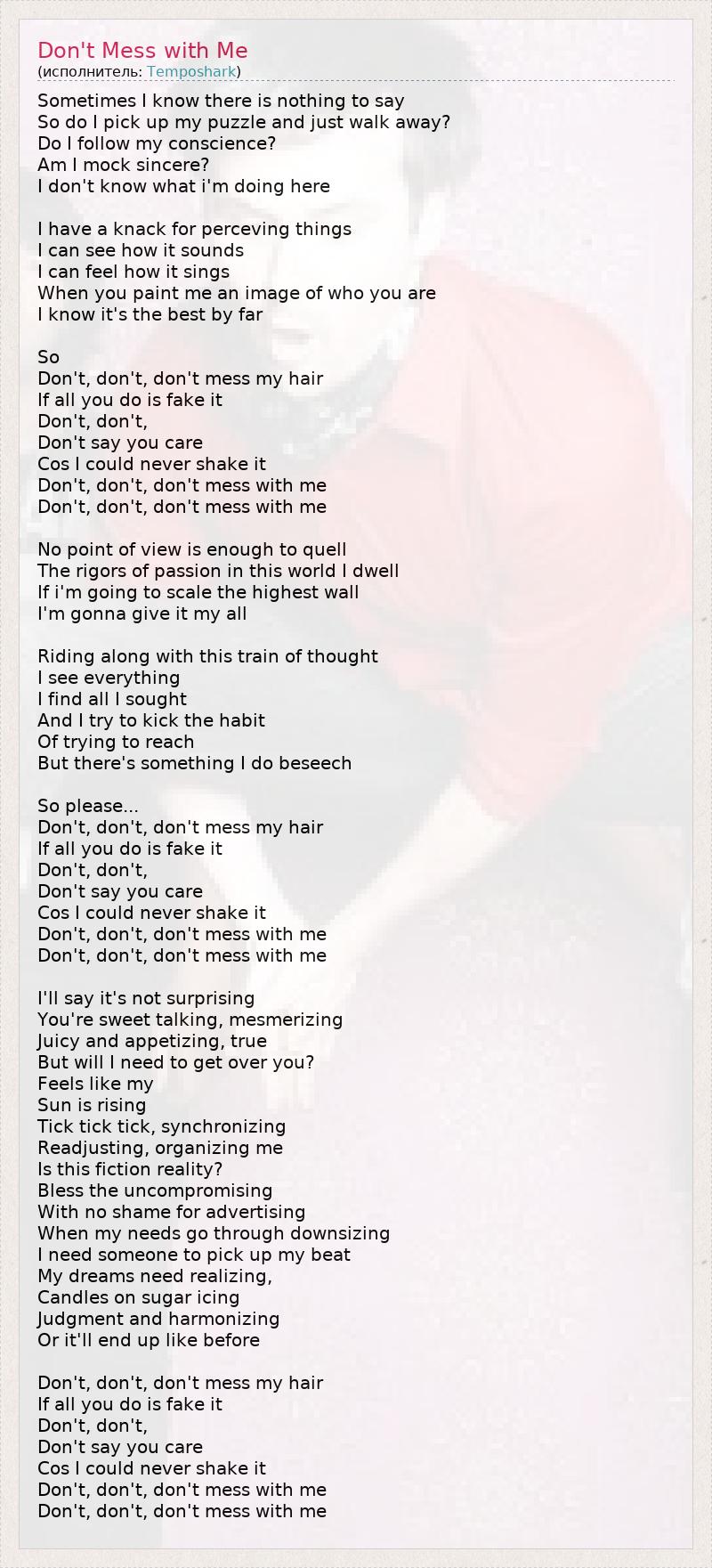 Sometimes I know there is nothing to say So do I pick up my puzzle and just walk away? Do I follow my conscience? Am I mock sincere? I don't know what i'm doing here I have a knack for perceving things I can see how it sounds I can feel how it sings When you paint me an image of who you are I know it's the best by far So Don't, don't, don't mess my hair If all you do is fake it Don't, don't, Don't say you care Cos I could never shake it Don't, don't, don't mess with me Don't, don't, don't mess with me No point of view is enough to quell The rigors of passion in this world I dwell If i'm going to scale the highest wall I'm gonna give it my all Riding along with this train of thought I see everything I find all I sought And I try to kick the habit Of trying to reach But there's something I do beseech So please... Don't, don't, don't mess my hair If all you do is fake it Don't, don't, Don't say you care Cos I could never shake it Don't, don't, don't mess with me Don't, don't, don't mess with me I'll say it's not surprising You're sweet talking, mesmerizing Juicy and appetizing, true But will I need to get over you? Feels like my Sun is rising Tick tick tick, synchronizing Readjusting, organizing me Is this fiction reality? Bless the uncompromising With no shame for advertising When my needs go through downsizing I need someone to pick up my beat My dreams need realizing, Candles on sugar icing Judgment and harmonizing Or it'll end up like before Don't, don't, don't mess my hair If all you do is fake it Don't, don't, Don't say you care Cos I could never shake it Don't, don't, don't mess with me Don't, don't, don't mess with me