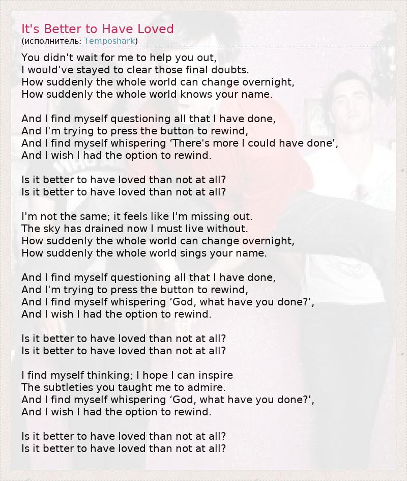 Ты не стала ждать, пока я спасу тебя, Хоть я бы остался, чтобы развеять последние сомнения. Как внезапно весь мир может измениться в одночасье, Как внезапно целый мир узнаёт твое имя. И я подвергаю сомнению все, что я сделал, И я пытаюсь нажать на кнопку перемотки, И я шепчу "я мог бы сделать больше", И я хочу, чтобы у меня была возможность все вернуть. Лучше ли полюбить, чем не любить вовсе? Лучше ли полюбить, чем не любить вовсе? Я не тот, что был раньше, такое чувство, что я исчез без вести. Теперь небеса иссохли и я вынужден их покинуть. Как внезапно целый мир может измениться в одночасье, Как внезапно целый мир воспевает твое имя. И я подвергаю сомнению все, что я сделал, И я пытаюсь нажать на кнопку перемотки, И я шепчу "Господи, что же я наделал?", И я хочу, чтобы у меня была возможность все вернуть. Лучше ли полюбить, чем не любить вовсе? Лучше ли полюбить, чем не любить вовсе? Я ловлю себя на мысли, я надеюсь, что меня воодушевят Те тонкости, которыми ты научила меня восхищаться. И я шепчу "Господи, что же я наделал?", И я хочу, чтобы у меня была возможность все вернуть. Лучше ли полюбить, чем не любить вовсе? Лучше ли полюбить, чем не любить вовсе?
