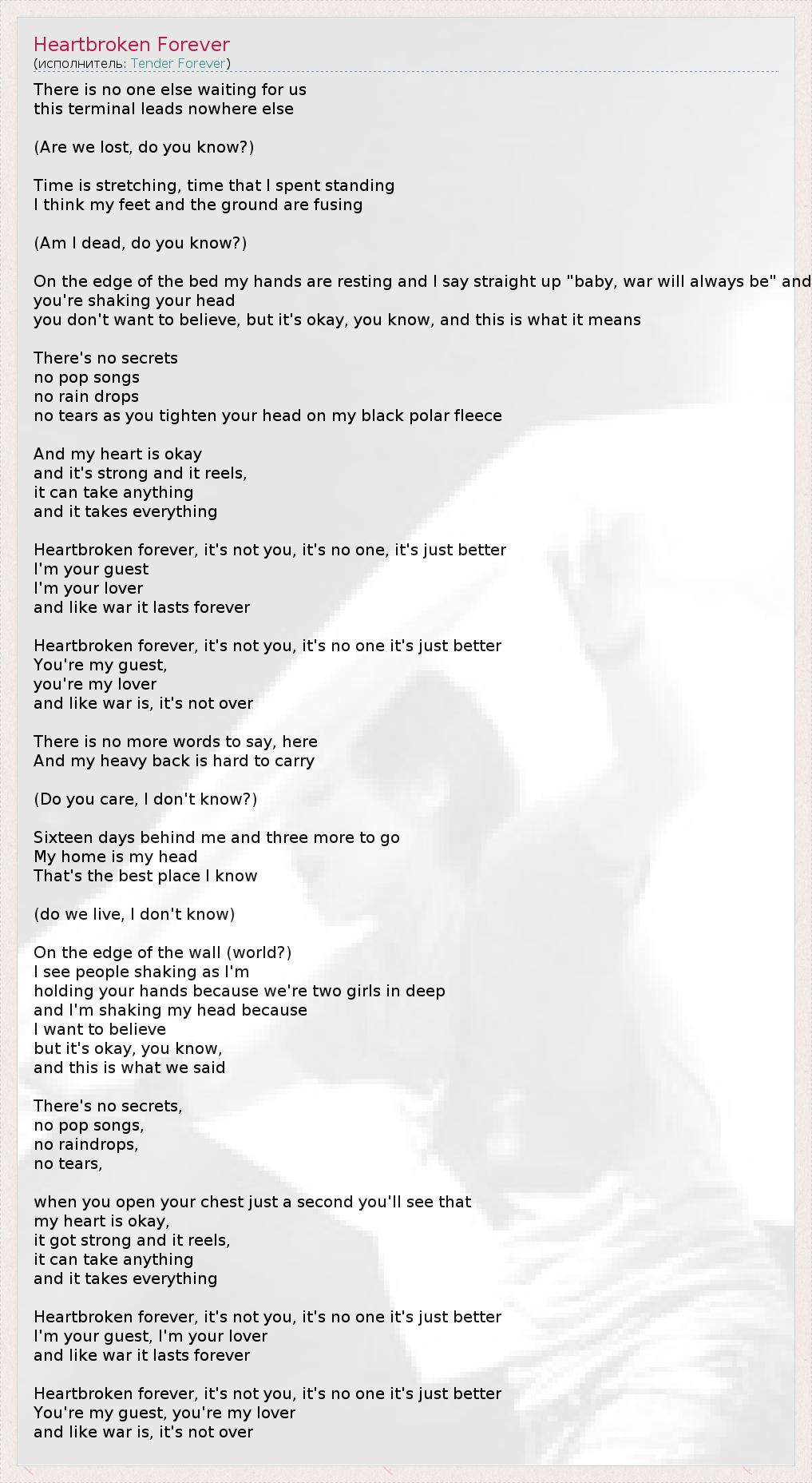 There is no one else waiting for us this terminal leads nowhere else (Are we lost, do you know?) Time is stretching, time that I spent standing I think my feet and the ground are fusing (Am I dead, do you know?) On the edge of the bed my hands are resting and I say straight up "baby, war will always be" and you're shaking your head you don't want to believe, but it's okay, you know, and this is what it means There's no secrets no pop songs no rain drops no tears as you tighten your head on my black polar fleece And my heart is okay and it's strong and it reels, it can take anything and it takes everything Heartbroken forever, it's not you, it's no one, it's just better I'm your guest I'm your lover and like war it lasts forever Heartbroken forever, it's not you, it's no one it's just better You're my guest, you're my lover and like war is, it's not over There is no more words to say, here And my heavy back is hard to carry (Do you care, I don't know?) Sixteen days behind me and three more to go My home is my head That's the best place I know (do we live, I don't know) On the edge of the wall (world?) I see people shaking as I'm holding your hands because we're two girls in deep and I'm shaking my head because I want to believe but it's okay, you know, and this is what we said There's no secrets, no pop songs, no raindrops, no tears, when you open your chest just a second you'll see that my heart is okay, it got strong and it reels, it can take anything and it takes everything Heartbroken forever, it's not you, it's no one it's just better I'm your guest, I'm your lover and like war it lasts forever Heartbroken forever, it's not you, it's no one it's just better You're my guest, you're my lover and like war is, it's not over