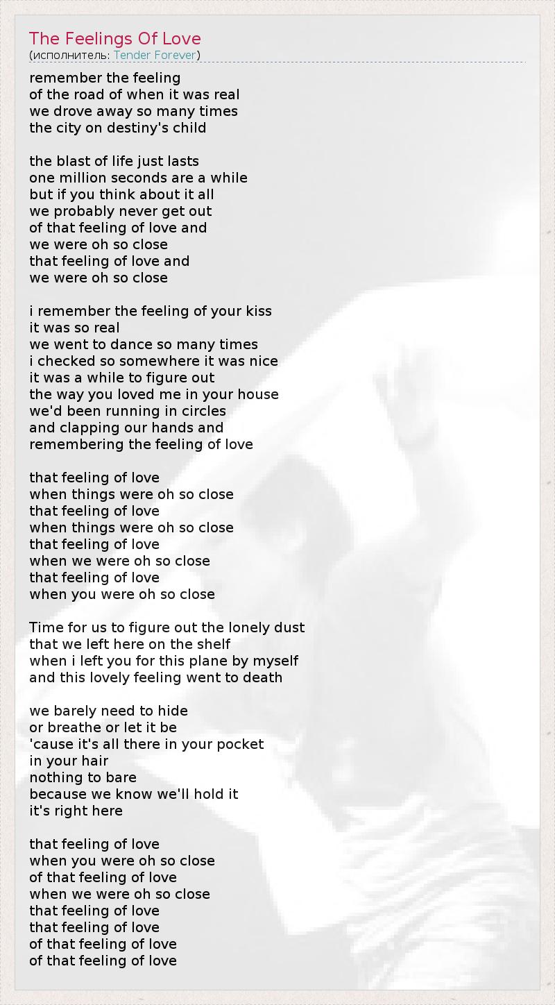 remember the feeling of the road of when it was real we drove away so many times the city on destiny's child the blast of life just lasts one million seconds are a while but if you think about it all we probably never get out of that feeling of love and we were oh so close that feeling of love and we were oh so close i remember the feeling of your kiss it was so real we went to dance so many times i checked so somewhere it was nice it was a while to figure out the way you loved me in your house we'd been running in circles and clapping our hands and remembering the feeling of love that feeling of love when things were oh so close that feeling of love when things were oh so close that feeling of love when we were oh so close that feeling of love when you were oh so close Time for us to figure out the lonely dust that we left here on the shelf when i left you for this plane by myself and this lovely feeling went to death we barely need to hide or breathe or let it be 'cause it's all there in your pocket in your hair nothing to bare because we know we'll hold it it's right here that feeling of love when you were oh so close of that feeling of love when we were oh so close that feeling of love that feeling of love of that feeling of love of that feeling of love