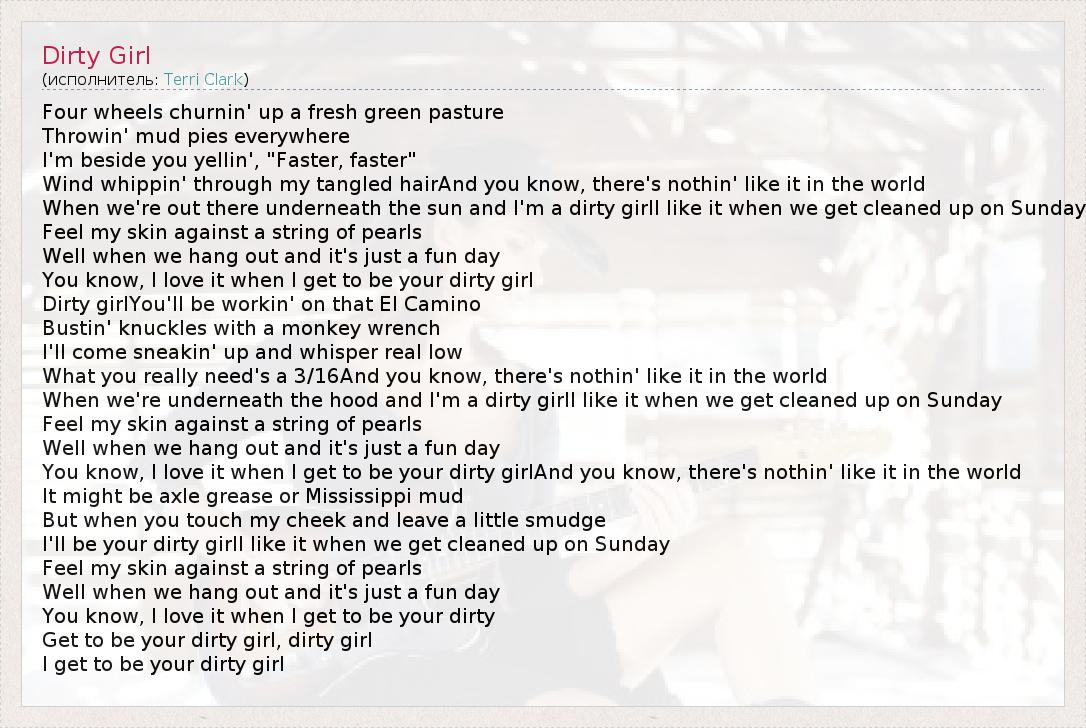 Four wheels churnin' up a fresh green pasture Throwin' mud pies everywhere I'm beside you yellin', "Faster, faster" Wind whippin' through my tangled hairAnd you know, there's nothin' like it in the world When we're out there underneath the sun and I'm a dirty girlI like it when we get cleaned up on Sunday Feel my skin against a string of pearls Well when we hang out and it's just a fun day You know, I love it when I get to be your dirty girl Dirty girlYou'll be workin' on that El Camino Bustin' knuckles with a monkey wrench I'll come sneakin' up and whisper real low What you really need's a 3/16And you know, there's nothin' like it in the world When we're underneath the hood and I'm a dirty girlI like it when we get cleaned up on Sunday Feel my skin against a string of pearls Well when we hang out and it's just a fun day You know, I love it when I get to be your dirty girlAnd you know, there's nothin' like it in the world It might be axle grease or Mississippi mud But when you touch my cheek and leave a little smudge I'll be your dirty girlI like it when we get cleaned up on Sunday Feel my skin against a string of pearls Well when we hang out and it's just a fun day You know, I love it when I get to be your dirty Get to be your dirty girl, dirty girl I get to be your dirty girl