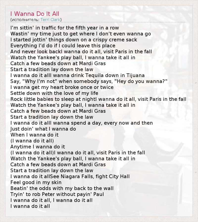 I'm sittin' in traffic for the fifth year in a row Wastin' my time just to get where I don't even wanna go I started jottin' things down on a crispy creme sack Everything I'd do if I could leave this place And never look backI wanna do it all, visit Paris in the fall Watch the Yankee's play ball, I wanna take it all in Catch a few beads down at Mardi Gras Start a tradition lay down the law I wanna do it allI wanna drink Tequila down in Tijuana Say, "Why I'm not" when somebody says, "Hey do you wanna?" I wanna get my heart broke once or twice Settle down with the love of my life Rock little babies to sleep at nightI wanna do it all, visit Paris in the fall Watch the Yankee's play ball, I wanna take it all in Catch a few beads down at Mardi Gras Start a tradition lay down the law I wanna do it allI wanna spend a day, every now and then Just doin' what I wanna do When I wanna do it (I wanna do it all) Anytime I wanna do it (I wanna do it all)I wanna do it all, visit Paris in the fall Watch the Yankee's play ball, I wanna take it all in Catch a few beads down at Mardi Gras Start a tradition lay down the law I wanna do it allSee Niagara Falls, fight City Hall Feel good in my skin Beatin' the odds with my back to the wall Tryin' to rob Peter without payin' Paul I wanna do it all, I wanna do it all I wanna do it all