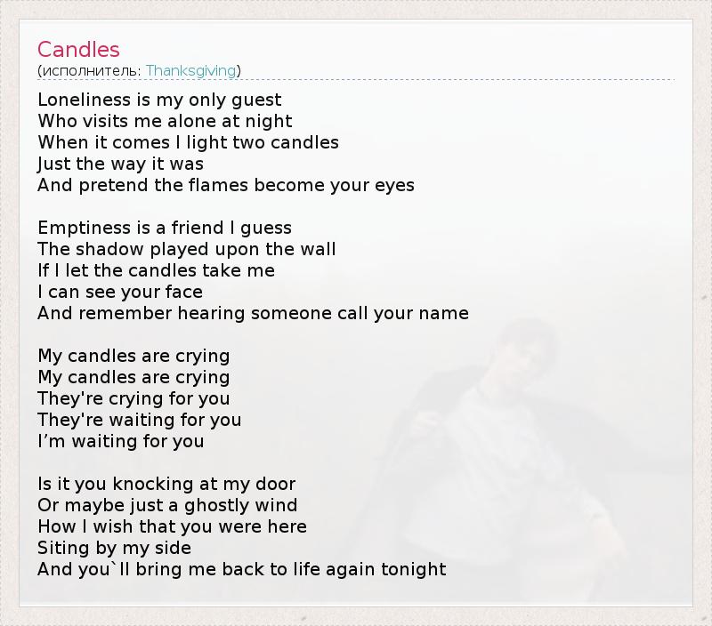 Loneliness is my only guest Who visits me alone at night When it comes I light two candles Just the way it was And pretend the flames become your eyes Emptiness is a friend I guess The shadow played upon the wall If I let the candles take me I can see your face And remember hearing someone call your name My candles are crying My candles are crying They're crying for you They're waiting for you I’m waiting for you Is it you knocking at my door Or maybe just a ghostly wind How I wish that you were here Siting by my side And you`ll bring me back to life again tonight