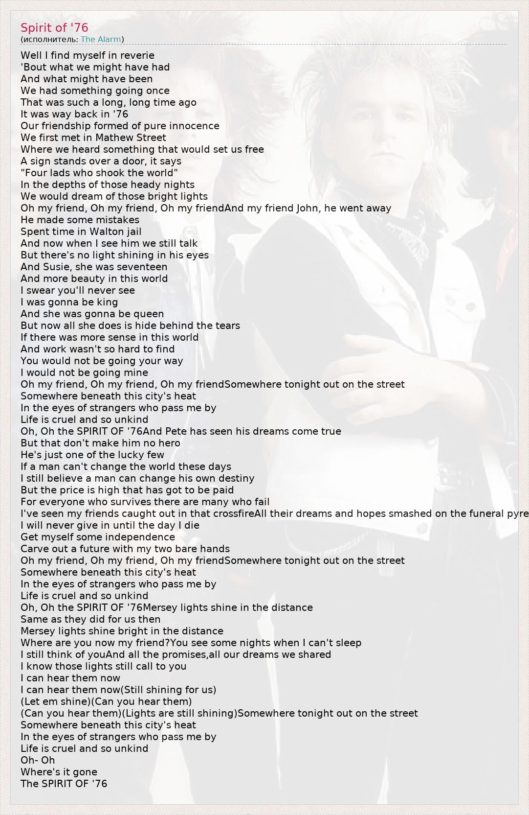 Well I find myself in reverie 'Bout what we might have had And what might have been We had something going once That was such a long, long time ago It was way back in '76 Our friendship formed of pure innocence We first met in Mathew Street Where we heard something that would set us free A sign stands over a door, it says "Four lads who shook the world" In the depths of those heady nights We would dream of those bright lights Oh my friend, Oh my friend, Oh my friendAnd my friend John, he went away He made some mistakes Spent time in Walton jail And now when I see him we still talk But there's no light shining in his eyes And Susie, she was seventeen And more beauty in this world I swear you'll never see I was gonna be king And she was gonna be queen But now all she does is hide behind the tears If there was more sense in this world And work wasn't so hard to find You would not be going your way I would not be going mine Oh my friend, Oh my friend, Oh my friendSomewhere tonight out on the street Somewhere beneath this city's heat In the eyes of strangers who pass me by Life is cruel and so unkind Oh, Oh the SPIRIT OF '76And Pete has seen his dreams come true But that don't make him no hero He's just one of the lucky few If a man can't change the world these days I still believe a man can change his own destiny But the price is high that has got to be paid For everyone who survives there are many who fail I've seen my friends caught out in that crossfireAll their dreams and hopes smashed on the funeral pyre I will never give in until the day I die Get myself some independence Carve out a future with my two bare hands Oh my friend, Oh my friend, Oh my friendSomewhere tonight out on the street Somewhere beneath this city's heat In the eyes of strangers who pass me by Life is cruel and so unkind Oh, Oh the SPIRIT OF '76Mersey lights shine in the distance Same as they did for us then Mersey lights shine bright in the distance Where are you now my friend?You see some nights when I can't sleep I still think of youAnd all the promises,all our dreams we shared I know those lights still call to you I can hear them now I can hear them now(Still shining for us) (Let em shine)(Can you hear them) (Can you hear them)(Lights are still shining)Somewhere tonight out on the street Somewhere beneath this city's heat In the eyes of strangers who pass me by Life is cruel and so unkind Oh- Oh Where's it gone The SPIRIT OF '76