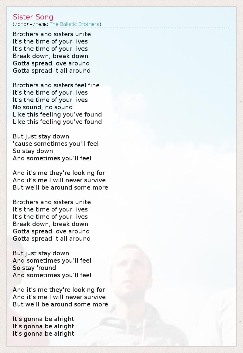 Brothers and sisters unite It's the time of your lives It's the time of your lives Break down, break down Gotta spread love around Gotta spread it all around Brothers and sisters feel fine It's the time of your lives It's the time of your lives No sound, no sound Like this feeling you've found Like this feeling you've found But just stay down 'cause sometimes you'll feel So stay down And sometimes you'll feel And it's me they're looking for And it's me I will never survive But we'll be around some more Brothers and sisters unite It's the time of your lives It's the time of your lives Break down, break down Gotta spread love around Gotta spread it all around But just stay down And sometimes you'll feel So stay 'round And sometimes you'll feel And it's me they're looking for And it's me I will never survive But we'll be around some more It's gonna be alright It's gonna be alright It's gonna be alright