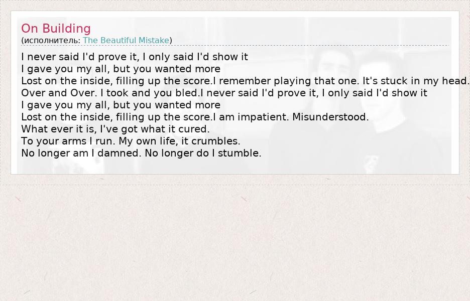 Это интересно:The Beautiful Mistake, группа из Сан Диего, Калифорния, основана в 2000м году, выпущенно 2 альбома дебютный - "Light A Match, For I Deserve To Burn" в 2002м, 2ой - "This Is Who You Are" в 2004м.дискографияDecember EP The Beautiful Mistake (EP) Light a Match, For I Deserve to Burn This Is Who You Are The Beautiful Mistake & Ettison Clio (Split EP) оффициальный сайт - thebeautifulmistake.commyspace - myspace.com/thebeautifulmistake