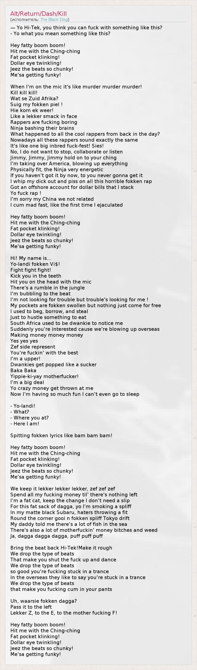 — Yo Hi-Tek, you think you can fuck with something like this? - Yo what you mean something like this? Hey fatty boom boom! Hit me with the Ching-ching Fat pocket klinking! Dollar eye twinkling! Jeez the beats so chunky! Me'sa getting funky! When I'm on the mic it's like murder murder murder! Kill kill kill! Wat se Zuid Afrika? Suig my fokken piel ! Hie kom ek weer! Like a lekker smack in face Rappers are fucking boring Ninja bashing their brains What happened to all the cool rappers from back in the day? Nowadays all these rappers sound exactly the same It's like one big inbred fuck-fest! Sies! No, I do not want to stop, collaborate or listen Jimmy, Jimmy, Jimmy hold on to your ching I'm taking over America, blowing up everything Physically fit, the Ninja very energetic If you haven't got it by now, to you never gonna get it I whip my dick out and piss on all this horrible fokken rap Got an offshore account for dollar bills that I stack Yo fuck rap ! I'm sorry my China we not related I cum mad fast, like the first time I ejaculated Hey fatty boom boom! Hit me with the Ching-ching Fat pocket klinking! Dollar eye twinkling! Jeez the beats so chunky! Me'sa getting funky! Hi! My name is... Yo-landi fokken Vi$! Fight fight fight! Kick you in the teeth Hit you on the head with the mic There's a rumble in the jungle I'm bubbling to the beat I'm not looking for trouble but trouble's looking for me ! My pockets are fokken swollen but nothing just come for free I used to beg, borrow, and steal Just to hustle something to eat South Africa used to be dwankie to notice me Suddenly you're interested cause we're blowing up overseas Making money money money Yes yes yes Zef side represent You're fuckin' with the best I'm a upper! Dwankies get popped like a sucker Baka Baka Yippie-ki-yay motherfucker! I'm a big deal Yo crazy money get thrown at me Now I'm having so much fun I can't even go to sleep - Yo-landi! - What? - Where you at? - Here I am! Spitting fokken lyrics like bam bam bam! Hey fatty boom boom! Hit me with the Ching-ching Fat pocket klinking! Dollar eye twinkling! Jeez the beats so chunky! Me'sa getting funky! We keep it lekker lekker lekker, zef zef zef Spend all my fucking money til' there's nothing left I'm a fat cat, keep the change I don't need a slip For this fat sack of dagga, yo I'm smoking a spliff In my matte black Subaru, haters throwing a fit Round the corner gooi n fokken spliff Tokyo drift My daddy told me there's a lot of fish in the sea There's also a lot of motherfuckin' money bitches and weed Ja, dagga dagga dagga, puff puff puff Bring the beat back Hi-Tek!Make it rough We drop the type of beats That make you shut the fuck up and dance We drop the type of beats so good you're fucking stuck in a trance In the overseas they like to say you're stuck in a trance We drop the type of beats that make you fucking cum in your pants Uh, waarsie fokken dagga? Pass it to the left Lekker Z, to the E, to the mother fucking F! Hey fatty boom boom! Hit me with the Ching-ching Fat pocket klinking! Dollar eye twinkling! Jeez the beats so chunky! Me'sa getting funky!