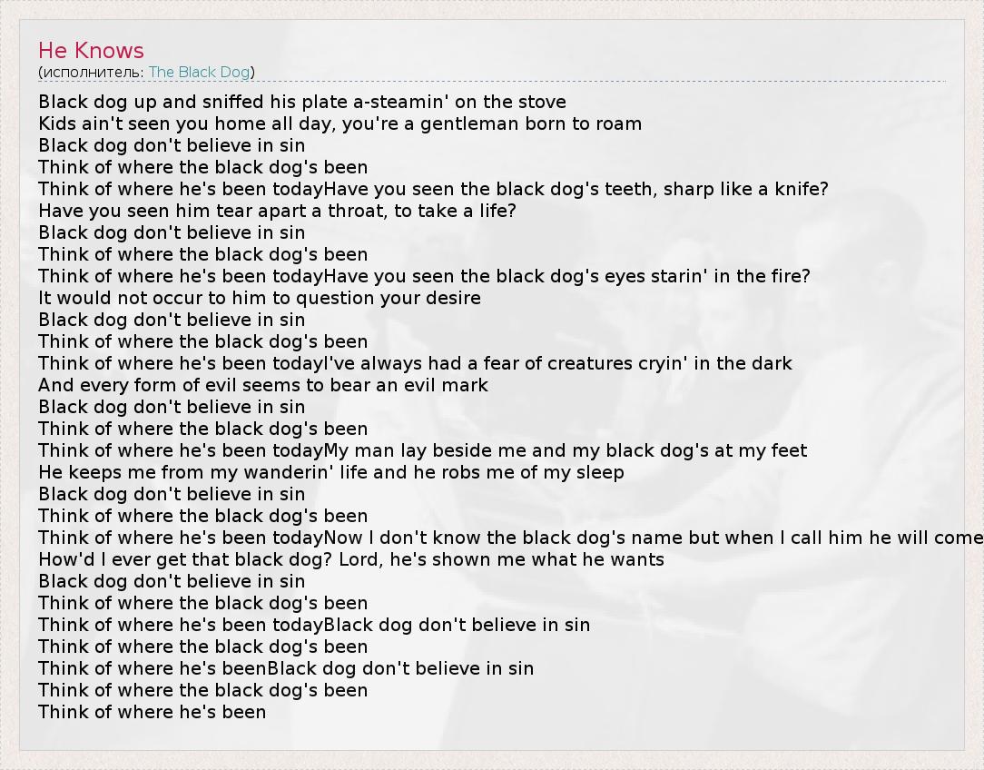 Black dog up and sniffed his plate a-steamin' on the stove Kids ain't seen you home all day, you're a gentleman born to roam Black dog don't believe in sin Think of where the black dog's been Think of where he's been todayHave you seen the black dog's teeth, sharp like a knife? Have you seen him tear apart a throat, to take a life? Black dog don't believe in sin Think of where the black dog's been Think of where he's been todayHave you seen the black dog's eyes starin' in the fire? It would not occur to him to question your desire Black dog don't believe in sin Think of where the black dog's been Think of where he's been todayI've always had a fear of creatures cryin' in the dark And every form of evil seems to bear an evil mark Black dog don't believe in sin Think of where the black dog's been Think of where he's been todayMy man lay beside me and my black dog's at my feet He keeps me from my wanderin' life and he robs me of my sleep Black dog don't believe in sin Think of where the black dog's been Think of where he's been todayNow I don't know the black dog's name but when I call him he will come How'd I ever get that black dog? Lord, he's shown me what he wants Black dog don't believe in sin Think of where the black dog's been Think of where he's been todayBlack dog don't believe in sin Think of where the black dog's been Think of where he's beenBlack dog don't believe in sin Think of where the black dog's been Think of where he's been