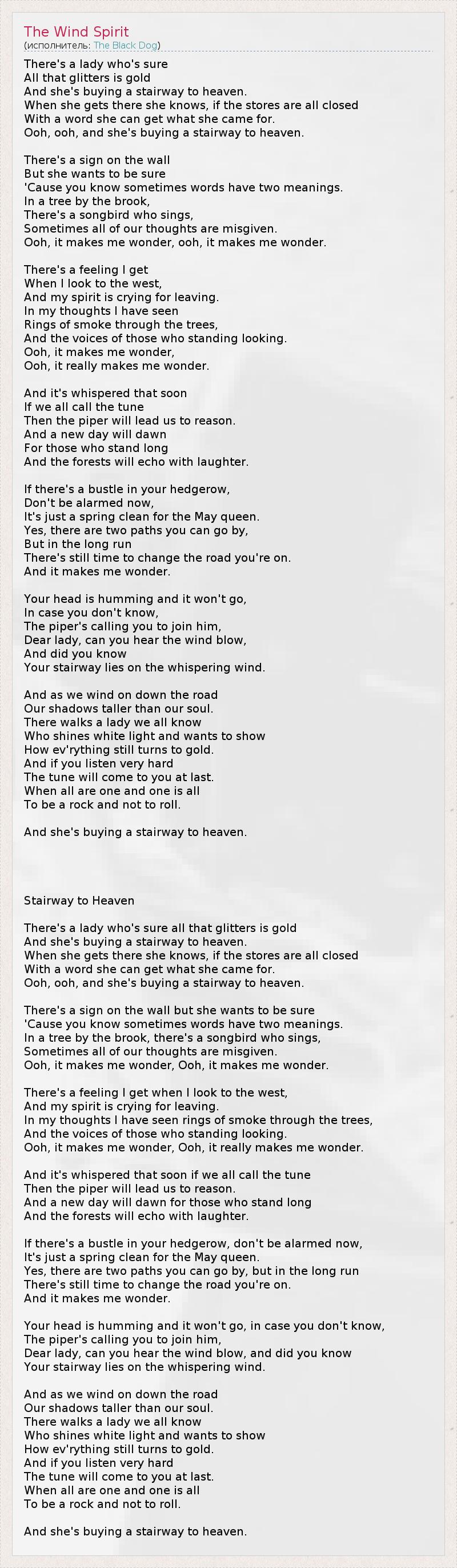 There's a lady who's sure All that glitters is gold And she's buying a stairway to heaven. When she gets there she knows, if the stores are all closed With a word she can get what she came for. Ooh, ooh, and she's buying a stairway to heaven. There's a sign on the wall But she wants to be sure 'Cause you know sometimes words have two meanings. In a tree by the brook, There's a songbird who sings, Sometimes all of our thoughts are misgiven. Ooh, it makes me wonder, ooh, it makes me wonder. There's a feeling I get When I look to the west, And my spirit is crying for leaving. In my thoughts I have seen Rings of smoke through the trees, And the voices of those who standing looking. Ooh, it makes me wonder, Ooh, it really makes me wonder. And it's whispered that soon If we all call the tune Then the piper will lead us to reason. And a new day will dawn For those who stand long And the forests will echo with laughter. If there's a bustle in your hedgerow, Don't be alarmed now, It's just a spring clean for the May queen. Yes, there are two paths you can go by, But in the long run There's still time to change the road you're on. And it makes me wonder. Your head is humming and it won't go, In case you don't know, The piper's calling you to join him, Dear lady, can you hear the wind blow, And did you know Your stairway lies on the whispering wind. And as we wind on down the road Our shadows taller than our soul. There walks a lady we all know Who shines white light and wants to show How ev'rything still turns to gold. And if you listen very hard The tune will come to you at last. When all are one and one is all To be a rock and not to roll. And she's buying a stairway to heaven. Stairway to Heaven There's a lady who's sure all that glitters is gold And she's buying a stairway to heaven. When she gets there she knows, if the stores are all closed With a word she can get what she came for. Ooh, ooh, and she's buying a stairway to heaven. There's a sign on the wall but she wants to be sure 'Cause you know sometimes words have two meanings. In a tree by the brook, there's a songbird who sings, Sometimes all of our thoughts are misgiven. Ooh, it makes me wonder, Ooh, it makes me wonder. There's a feeling I get when I look to the west, And my spirit is crying for leaving. In my thoughts I have seen rings of smoke through the trees, And the voices of those who standing looking. Ooh, it makes me wonder, Ooh, it really makes me wonder. And it's whispered that soon if we all call the tune Then the piper will lead us to reason. And a new day will dawn for those who stand long And the forests will echo with laughter. If there's a bustle in your hedgerow, don't be alarmed now, It's just a spring clean for the May queen. Yes, there are two paths you can go by, but in the long run There's still time to change the road you're on. And it makes me wonder. Your head is humming and it won't go, in case you don't know, The piper's calling you to join him, Dear lady, can you hear the wind blow, and did you know Your stairway lies on the whispering wind. And as we wind on down the road Our shadows taller than our soul. There walks a lady we all know Who shines white light and wants to show How ev'rything still turns to gold. And if you listen very hard The tune will come to you at last. When all are one and one is all To be a rock and not to roll. And she's buying a stairway to heaven.