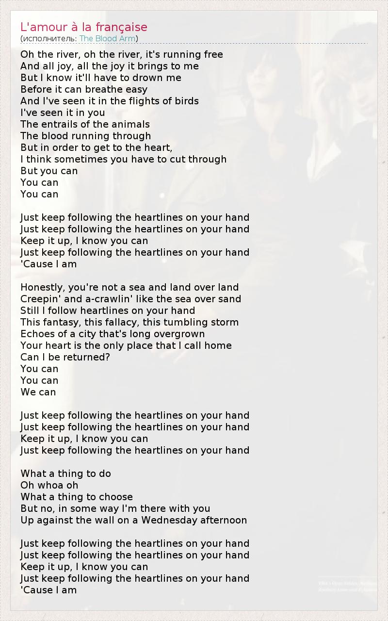 Oh the river, oh the river, it's running free And all joy, all the joy it brings to me But I know it'll have to drown me Before it can breathe easy And I've seen it in the flights of birds I've seen it in you The entrails of the animals The blood running through But in order to get to the heart, I think sometimes you have to cut through But you can You can You can Just keep following the heartlines on your hand Just keep following the heartlines on your hand Keep it up, I know you can Just keep following the heartlines on your hand 'Cause I am Honestly, you're not a sea and land over land Creepin' and a-crawlin' like the sea over sand Still I follow heartlines on your hand This fantasy, this fallacy, this tumbling storm Echoes of a city that's long overgrown Your heart is the only place that I call home Can I be returned? You can You can We can Just keep following the heartlines on your hand Just keep following the heartlines on your hand Keep it up, I know you can Just keep following the heartlines on your hand What a thing to do Oh whoa oh What a thing to choose But no, in some way I'm there with you Up against the wall on a Wednesday afternoon Just keep following the heartlines on your hand Just keep following the heartlines on your hand Keep it up, I know you can Just keep following the heartlines on your hand 'Cause I am