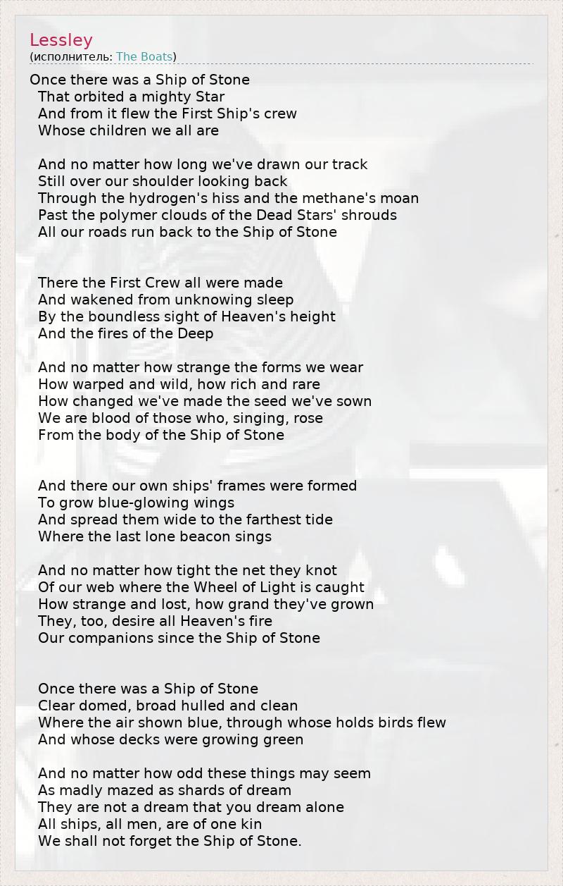 Once there was a Ship of Stone That orbited a mighty Star And from it flew the First Ship's crew Whose children we all are And no matter how long we've drawn our track Still over our shoulder looking back Through the hydrogen's hiss and the methane's moan Past the polymer clouds of the Dead Stars' shrouds All our roads run back to the Ship of Stone There the First Crew all were made And wakened from unknowing sleep By the boundless sight of Heaven's height And the fires of the Deep And no matter how strange the forms we wear How warped and wild, how rich and rare How changed we've made the seed we've sown We are blood of those who, singing, rose From the body of the Ship of Stone And there our own ships' frames were formed To grow blue-glowing wings And spread them wide to the farthest tide Where the last lone beacon sings And no matter how tight the net they knot Of our web where the Wheel of Light is caught How strange and lost, how grand they've grown They, too, desire all Heaven's fire Our companions since the Ship of Stone Once there was a Ship of Stone Clear domed, broad hulled and clean Where the air shown blue, through whose holds birds flew And whose decks were growing green And no matter how odd these things may seem As madly mazed as shards of dream They are not a dream that you dream alone All ships, all men, are of one kin We shall not forget the Ship of Stone.