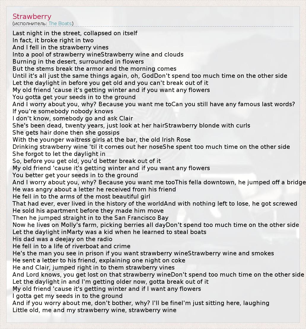 And Lord knows, you get lost on that strawberry wineDon't spend too much time on the other side