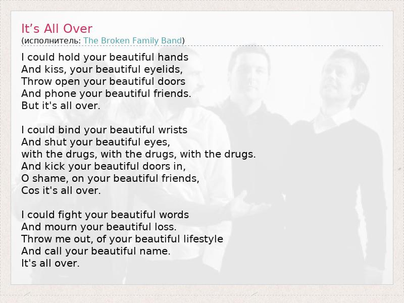 Это интересно:Группа, играющая британский рок, из Камбриджа-Лондон.Состав:Steven AdamsJay WilliamsGavin JohnsonMick RomanДискография:1)"Hello Love" - Jul 20072)"Balls" (Track & Field) - Feb 20063)"Welcome Home, Loser" (Track & Field) - Feb 20054)"Cold Water Songs" (Snowstorm Records) - Jun 2003Официальный сайт The Broken Family:http://www.thebrokenfamilyband.com/