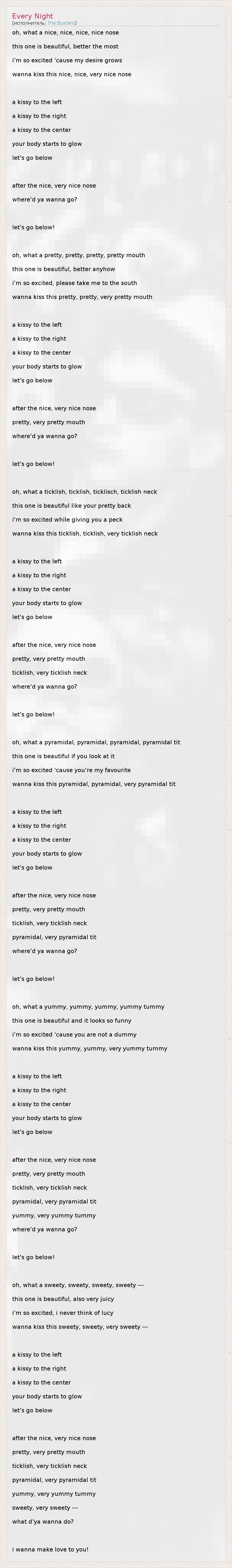 oh, what a nice, nice, nice, nice nose this one is beautiful, better the most i'm so excited ‘cause my desire grows wanna kiss this nice, nice, very nice nose a kissy to the left a kissy to the right a kissy to the center your body starts to glow let's go below after the nice, very nice nose where'd ya wanna go? let's go below! oh, what a pretty, pretty, pretty, pretty mouth this one is beautiful, better anyhow i'm so excited, please take me to the south wanna kiss this pretty, pretty, very pretty mouth a kissy to the left a kissy to the right a kissy to the center your body starts to glow let's go below after the nice, very nice nose pretty, very pretty mouth where'd ya wanna go? let's go below! oh, what a ticklish, ticklish, ticklisch, ticklish neck this one is beautiful like your pretty back i'm so excited while giving you a peck wanna kiss this ticklish, ticklish, very ticklish neck a kissy to the left a kissy to the right a kissy to the center your body starts to glow let's go below after the nice, very nice nose pretty, very pretty mouth ticklish, very ticklish neck where'd ya wanna go? let's go below! oh, what a pyramidal, pyramidal, pyramidal, pyramidal tit this one is beautiful if you look at it i'm so excited ‘cause you're my favourite wanna kiss this pyramidal, pyramidal, very pyramidal tit a kissy to the left a kissy to the right a kissy to the center your body starts to glow let's go below after the nice, very nice nose pretty, very pretty mouth ticklish, very ticklish neck pyramidal, very pyramidal tit where'd ya wanna go? let's go below! oh, what a yummy, yummy, yummy, yummy tummy this one is beautiful and it looks so funny i'm so excited ‘cause you are not a dummy wanna kiss this yummy, yummy, very yummy tummy a kissy to the left a kissy to the right a kissy to the center your body starts to glow let's go below after the nice, very nice nose pretty, very pretty mouth ticklish, very ticklish neck pyramidal, very pyramidal tit yummy, very yummy tummy where'd ya wanna go? let's go below! oh, what a sweety, sweety, sweety, sweety --- this one is beautiful, also very juicy i'm so excited, i never think of lucy wanna kiss this sweety, sweety, very sweety --- a kissy to the left a kissy to the right a kissy to the center your body starts to glow let's go below after the nice, very nice nose pretty, very pretty mouth ticklish, very ticklish neck pyramidal, very pyramidal tit yummy, very yummy tummy sweety, very sweety --- what d'ya wanna do? i wanna make love to you!