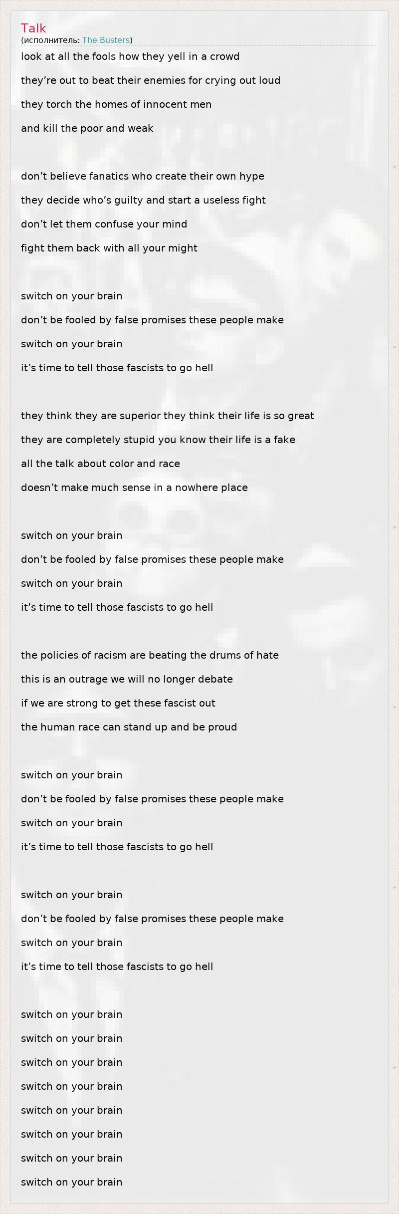 Это интересно:The Busters are a German third wave ska band who were formed in 1987. Playing 2 Tone-influenced ska, they became the best-known German ska band by having minor hit singles in Germany with "Ska Muzik" and a ska cover of Bobby McFerrin's "Don't Worry Be Happy". They signed to Sony Music in Germany in 1996, and released the albums Stompede and the Best of compilation Boost Best. As of 2009, they continue to tour Germany every Christmas, play outdoor festivals during the summer and run their own independent record label, Ska Revolution Records.The Busters are currently recording a new album.