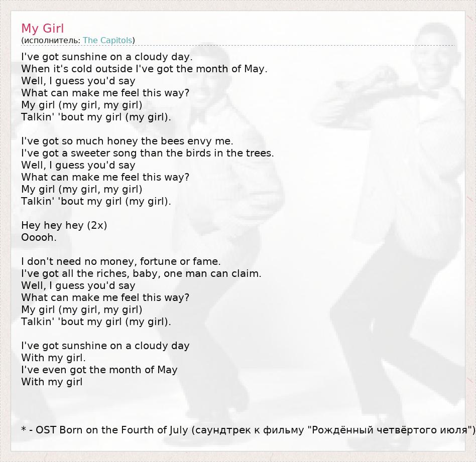 I've got sunshine on a cloudy day. When it's cold outside I've got the month of May. Well, I guess you'd say What can make me feel this way? My girl (my girl, my girl) Talkin' 'bout my girl (my girl). I've got so much honey the bees envy me. I've got a sweeter song than the birds in the trees. Well, I guess you'd say What can make me feel this way? My girl (my girl, my girl) Talkin' 'bout my girl (my girl). Hey hey hey (2x) Ooooh. I don't need no money, fortune or fame. I've got all the riches, baby, one man can claim. Well, I guess you'd say What can make me feel this way? My girl (my girl, my girl) Talkin' 'bout my girl (my girl). I've got sunshine on a cloudy day With my girl. I've even got the month of May With my girl * - OST Born on the Fourth of July (саундтрек к фильму "Рождённый четвёртого июля")