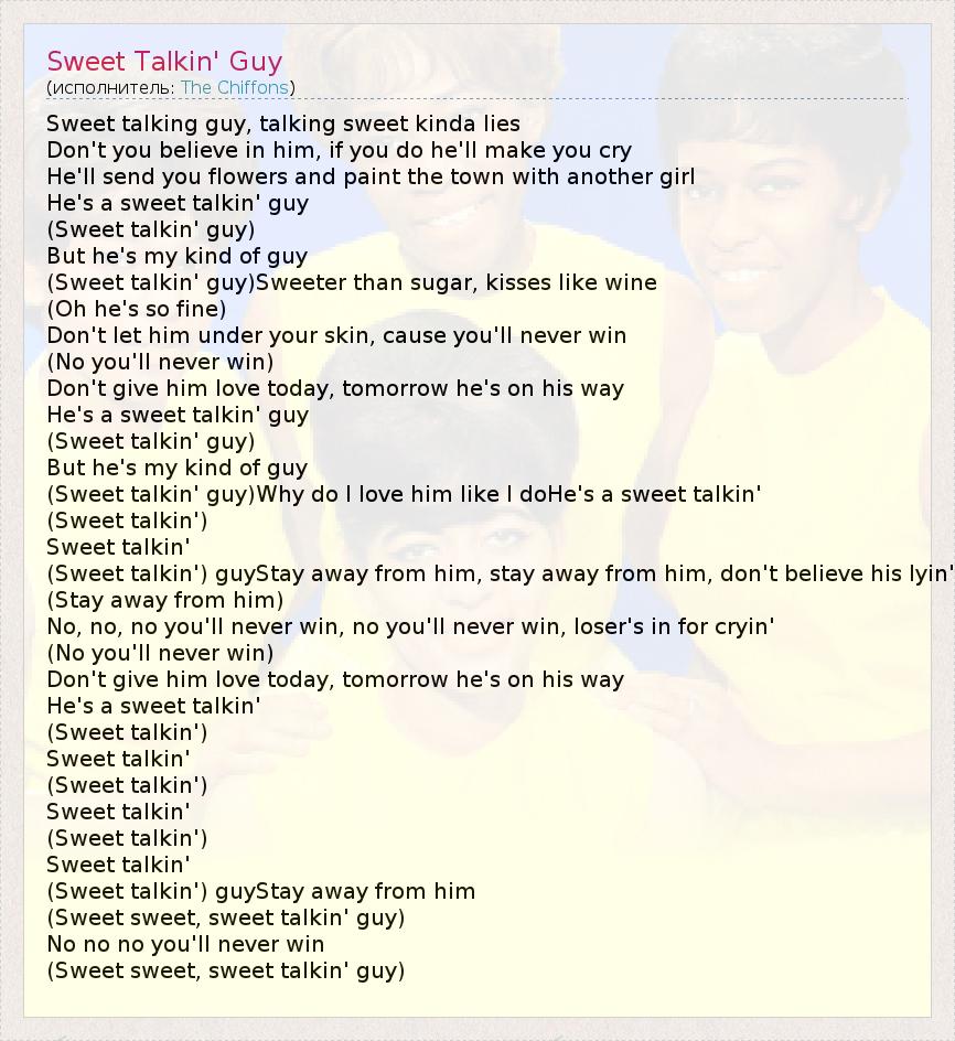 А как ты думаешь, о чем песня "Sweet Talkin' Guy" ?