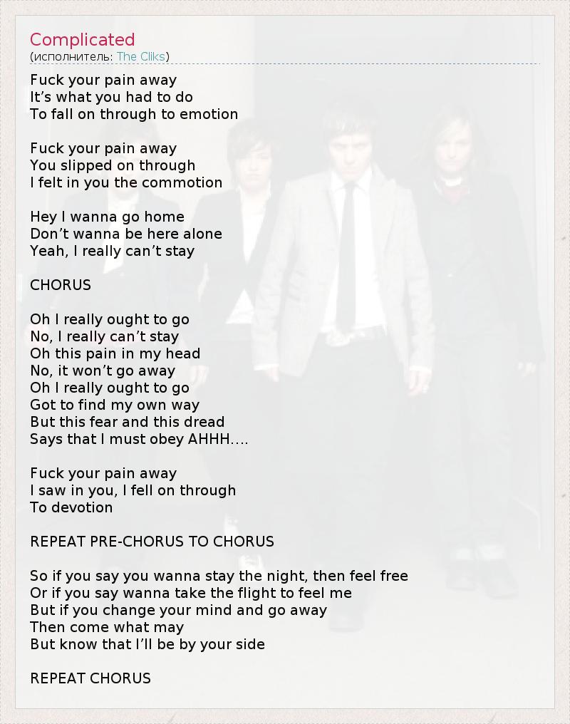 Fuck your pain away It’s what you had to do To fall on through to emotion Fuck your pain away You slipped on through I felt in you the commotion Hey I wanna go home Don’t wanna be here alone Yeah, I really can’t stay CHORUS Oh I really ought to go No, I really can’t stay Oh this pain in my head No, it won’t go away Oh I really ought to go Got to find my own way But this fear and this dread Says that I must obey AHHH…. Fuck your pain away I saw in you, I fell on through To devotion REPEAT PRE-CHORUS TO CHORUS So if you say you wanna stay the night, then feel free Or if you say wanna take the flight to feel me But if you change your mind and go away Then come what may But know that I’ll be by your side REPEAT CHORUS