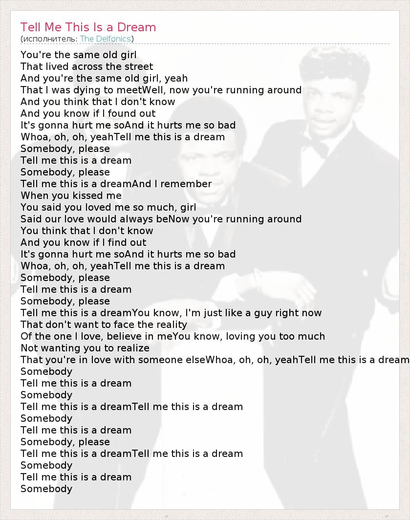 You're the same old girl That lived across the street And you're the same old girl, yeah That I was dying to meetWell, now you're running around And you think that I don't know And you know if I found out It's gonna hurt me soAnd it hurts me so bad Whoa, oh, oh, yeahTell me this is a dream Somebody, please Tell me this is a dream Somebody, please Tell me this is a dreamAnd I remember When you kissed me You said you loved me so much, girl Said our love would always beNow you're running around You think that I don't know And you know if I find out It's gonna hurt me soAnd it hurts me so bad Whoa, oh, oh, yeahTell me this is a dream Somebody, please Tell me this is a dream Somebody, please Tell me this is a dreamYou know, I'm just like a guy right now That don't want to face the reality Of the one I love, believe in meYou know, loving you too much Not wanting you to realize That you're in love with someone elseWhoa, oh, oh, yeahTell me this is a dream Somebody Tell me this is a dream Somebody Tell me this is a dreamTell me this is a dream Somebody Tell me this is a dream Somebody, please Tell me this is a dreamTell me this is a dream Somebody Tell me this is a dream Somebody