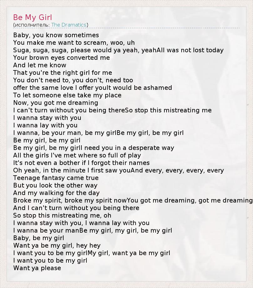 Baby, you know sometimes You make me want to scream, woo, uh Suga, suga, suga, please would ya yeah, yeahAll was not lost today Your brown eyes converted me And let me know That you're the right girl for me You don't need to, you don't, need too offer the same love I offer youIt would be ashamed To let someone else take my place Now, you got me dreaming I can't turn without you being thereSo stop this mistreating me I wanna stay with you I wanna lay with you I wanna, be your man, be my girlBe my girl, be my girl Be my girl, be my girl Be my girl, be my girlI need you in a desperate way All the girls I've met where so full of play It's not even a bother if I forgot their names Oh yeah, in the minute I first saw youAnd every, every, every, every Teenage fantasy came true But you look the other way And my walking for the day Broke my spirit, broke my spirit nowYou got me dreaming, got me dreaming And I can't turn without you being there So stop this mistreating me, oh I wanna stay with you, I wanna lay with you I wanna be your manBe my girl, my girl, be my girl Baby, be my girl Want ya be my girl, hey hey I want you to be my girlMy girl, want ya be my girl I want you to be my girl Want ya please