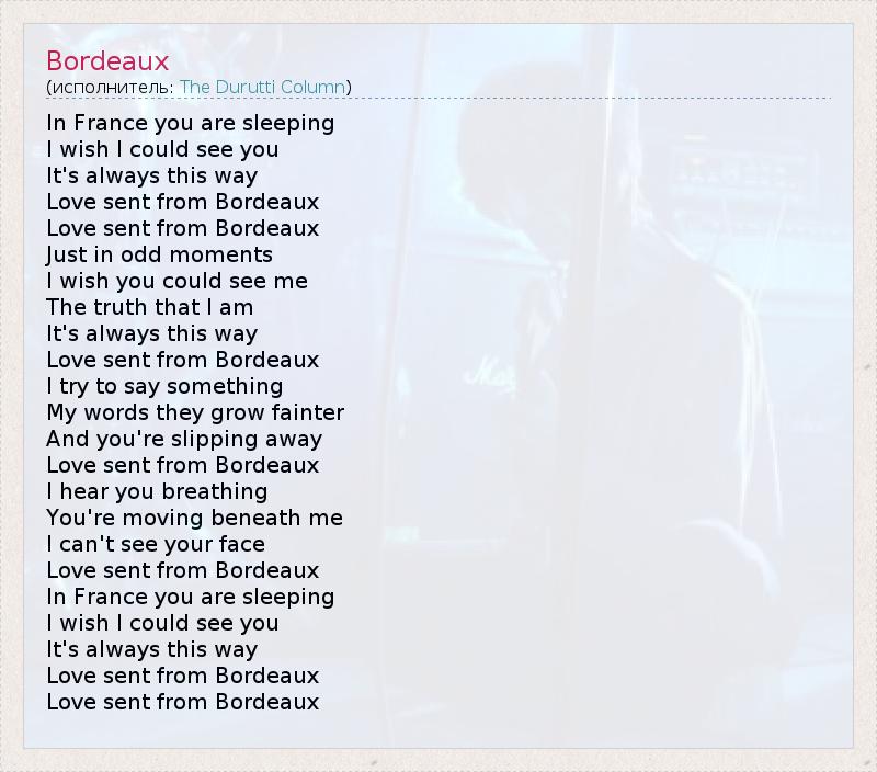 In France you are sleeping I wish I could see you It's always this way Love sent from Bordeaux Love sent from Bordeaux Just in odd moments I wish you could see me The truth that I am It's always this way Love sent from Bordeaux I try to say something My words they grow fainter And you're slipping away Love sent from Bordeaux I hear you breathing You're moving beneath me I can't see your face Love sent from Bordeaux In France you are sleeping I wish I could see you It's always this way Love sent from Bordeaux Love sent from Bordeaux