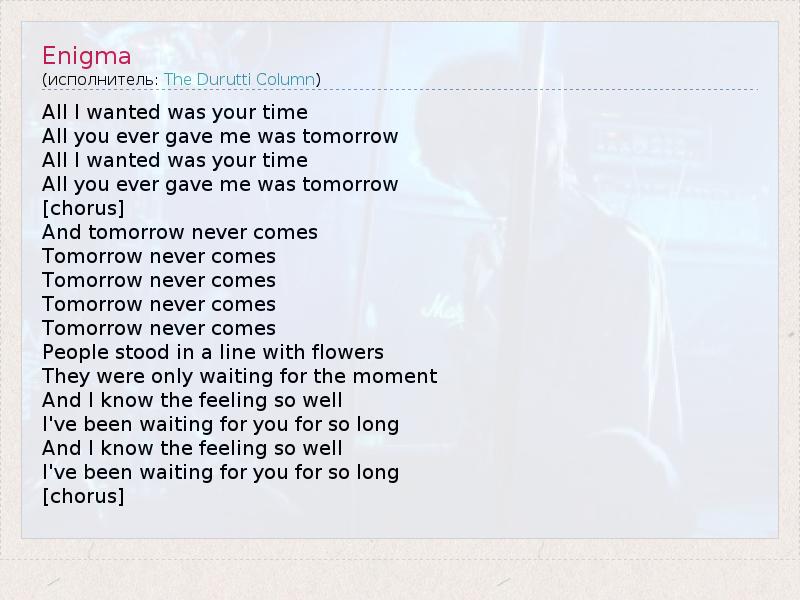 All I wanted was your time All you ever gave me was tomorrow All I wanted was your time All you ever gave me was tomorrow [chorus] And tomorrow never comes Tomorrow never comes Tomorrow never comes Tomorrow never comes Tomorrow never comes People stood in a line with flowers They were only waiting for the moment And I know the feeling so well I've been waiting for you for so long And I know the feeling so well I've been waiting for you for so long [chorus]