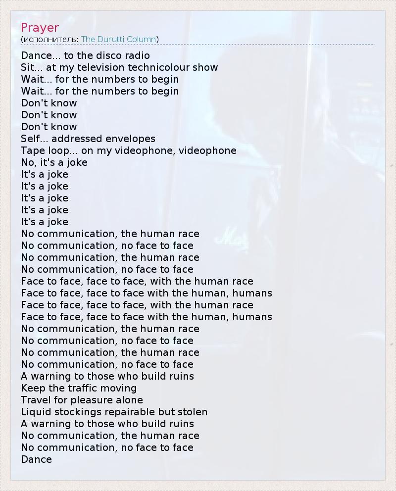 Dance... to the disco radio Sit... at my television technicolour show Wait... for the numbers to begin Wait... for the numbers to begin Don't know Don't know Don't know Self... addressed envelopes Tape loop... on my videophone, videophone No, it's a joke It's a joke It's a joke It's a joke It's a joke It's a joke No communication, the human race No communication, no face to face No communication, the human race No communication, no face to face Face to face, face to face, with the human race Face to face, face to face with the human, humans Face to face, face to face, with the human race Face to face, face to face with the human, humans No communication, the human race No communication, no face to face No communication, the human race No communication, no face to face A warning to those who build ruins Keep the traffic moving Travel for pleasure alone Liquid stockings repairable but stolen A warning to those who build ruins No communication, the human race No communication, no face to face Dance