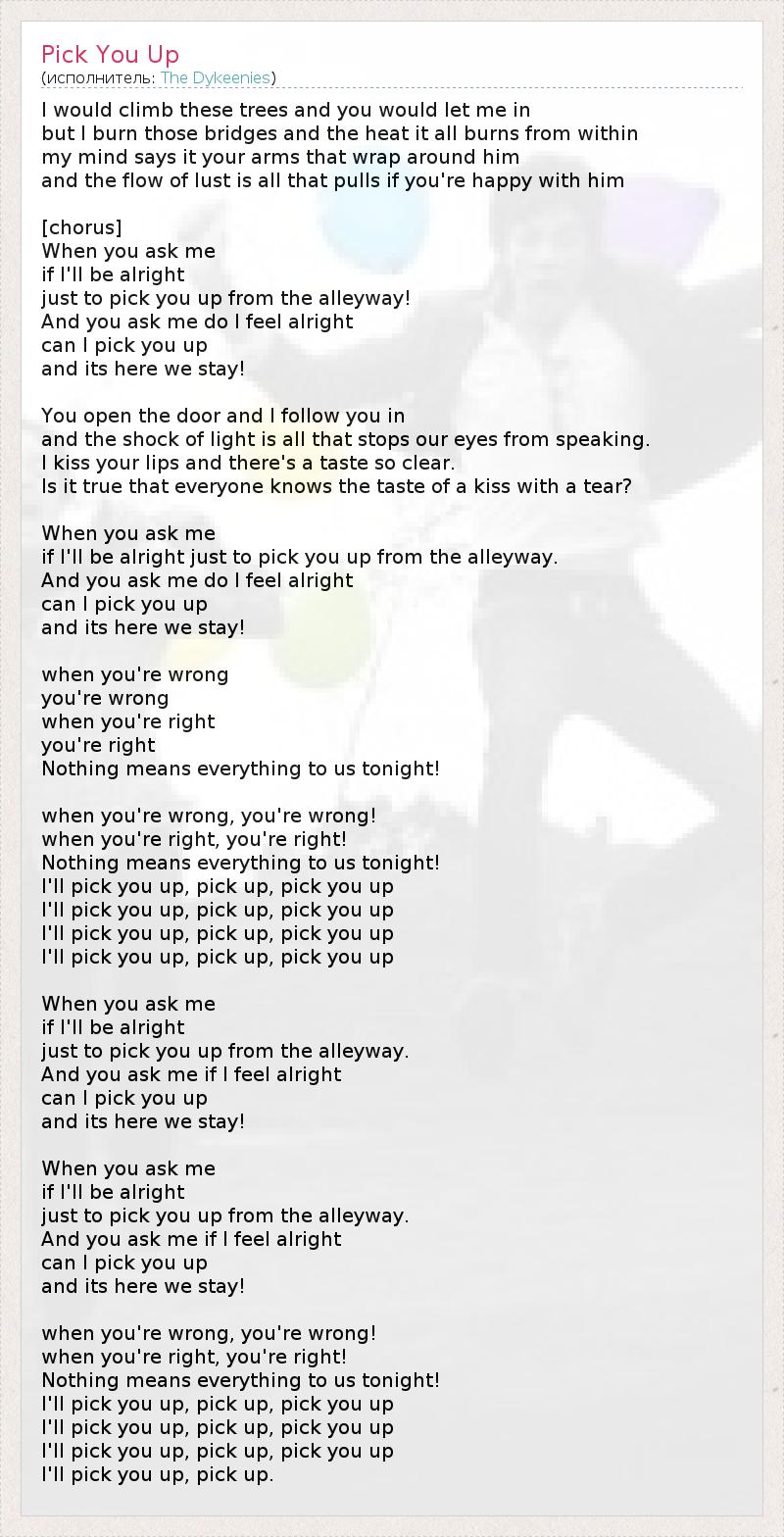 I would climb these trees and you would let me in but I burn those bridges and the heat it all burns from within my mind says it your arms that wrap around him and the flow of lust is all that pulls if you're happy with him [chorus] When you ask me if I'll be alright just to pick you up from the alleyway! And you ask me do I feel alright can I pick you up and its here we stay! You open the door and I follow you in and the shock of light is all that stops our eyes from speaking. I kiss your lips and there's a taste so clear. Is it true that everyone knows the taste of a kiss with a tear? When you ask me if I'll be alright just to pick you up from the alleyway. And you ask me do I feel alright can I pick you up and its here we stay! when you're wrong you're wrong when you're right you're right Nothing means everything to us tonight! when you're wrong, you're wrong! when you're right, you're right! Nothing means everything to us tonight! I'll pick you up, pick up, pick you up I'll pick you up, pick up, pick you up I'll pick you up, pick up, pick you up I'll pick you up, pick up, pick you up When you ask me if I'll be alright just to pick you up from the alleyway. And you ask me if I feel alright can I pick you up and its here we stay! When you ask me if I'll be alright just to pick you up from the alleyway. And you ask me if I feel alright can I pick you up and its here we stay! when you're wrong, you're wrong! when you're right, you're right! Nothing means everything to us tonight! I'll pick you up, pick up, pick you up I'll pick you up, pick up, pick you up I'll pick you up, pick up, pick you up I'll pick you up, pick up.