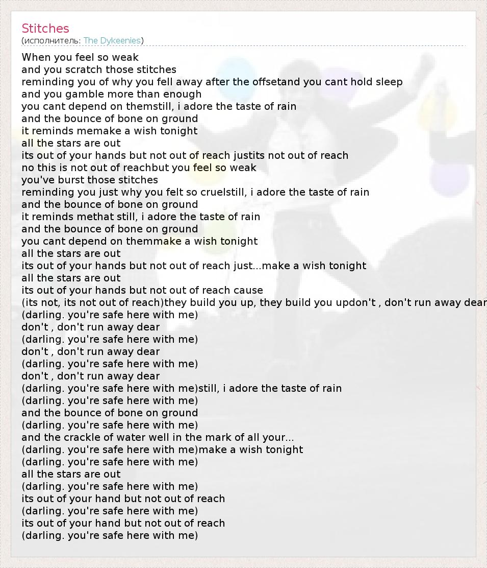 When you feel so weak and you scratch those stitches reminding you of why you fell away after the offsetand you cant hold sleep and you gamble more than enough you cant depend on themstill, i adore the taste of rain and the bounce of bone on ground it reminds memake a wish tonight all the stars are out its out of your hands but not out of reach justits not out of reach no this is not out of reachbut you feel so weak you've burst those stitches reminding you just why you felt so cruelstill, i adore the taste of rain and the bounce of bone on ground it reminds methat still, i adore the taste of rain and the bounce of bone on ground you cant depend on themmake a wish tonight all the stars are out its out of your hands but not out of reach just...make a wish tonight all the stars are out its out of your hands but not out of reach cause (its not, its not out of reach)they build you up, they build you updon't , don't run away dear (darling. you're safe here with me) don't , don't run away dear (darling. you're safe here with me) don't , don't run away dear (darling. you're safe here with me) don't , don't run away dear (darling. you're safe here with me)still, i adore the taste of rain (darling. you're safe here with me) and the bounce of bone on ground (darling. you're safe here with me) and the crackle of water well in the mark of all your... (darling. you're safe here with me)make a wish tonight (darling. you're safe here with me) all the stars are out (darling. you're safe here with me) its out of your hand but not out of reach (darling. you're safe here with me) its out of your hand but not out of reach (darling. you're safe here with me)