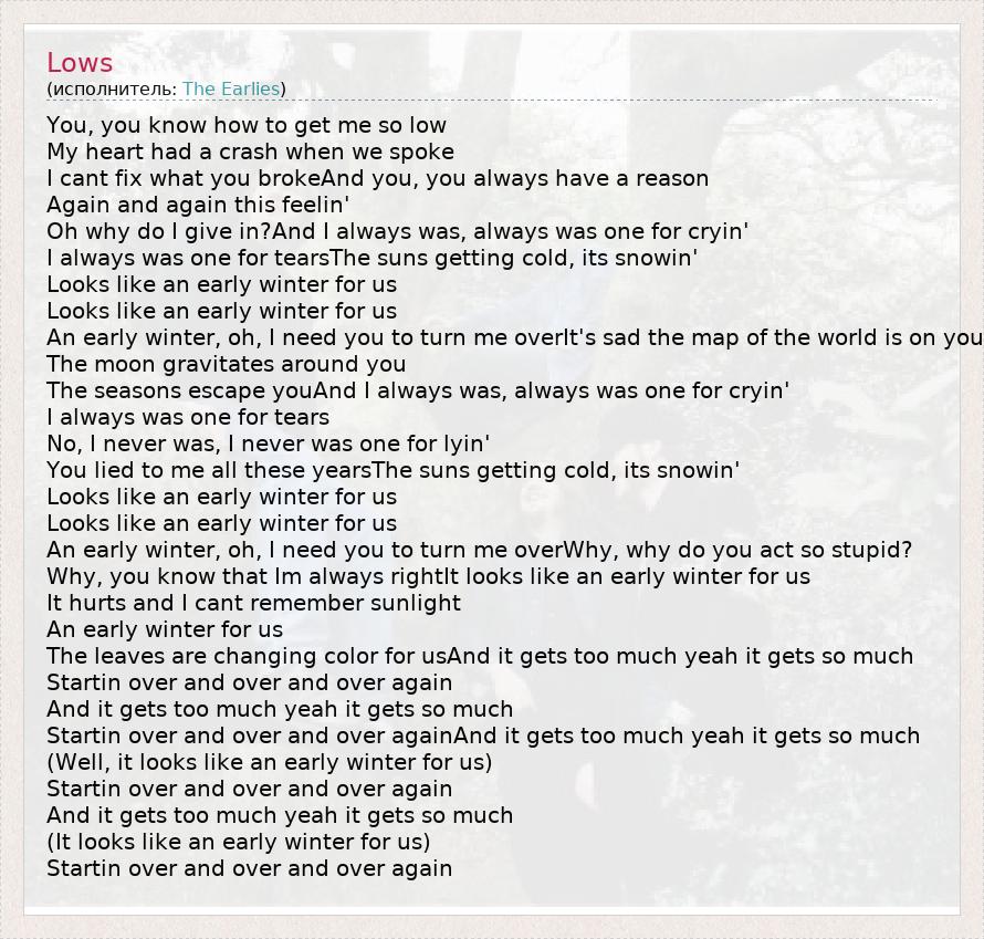 You, you know how to get me so low My heart had a crash when we spoke I cant fix what you brokeAnd you, you always have a reason Again and again this feelin' Oh why do I give in?And I always was, always was one for cryin' I always was one for tearsThe suns getting cold, its snowin' Looks like an early winter for us Looks like an early winter for us An early winter, oh, I need you to turn me overIt's sad the map of the world is on you The moon gravitates around you The seasons escape youAnd I always was, always was one for cryin' I always was one for tears No, I never was, I never was one for lyin' You lied to me all these yearsThe suns getting cold, its snowin' Looks like an early winter for us Looks like an early winter for us An early winter, oh, I need you to turn me overWhy, why do you act so stupid? Why, you know that Im always rightIt looks like an early winter for us It hurts and I cant remember sunlight An early winter for us The leaves are changing color for usAnd it gets too much yeah it gets so much Startin over and over and over again And it gets too much yeah it gets so much Startin over and over and over againAnd it gets too much yeah it gets so much (Well, it looks like an early winter for us) Startin over and over and over again And it gets too much yeah it gets so much (It looks like an early winter for us) Startin over and over and over again